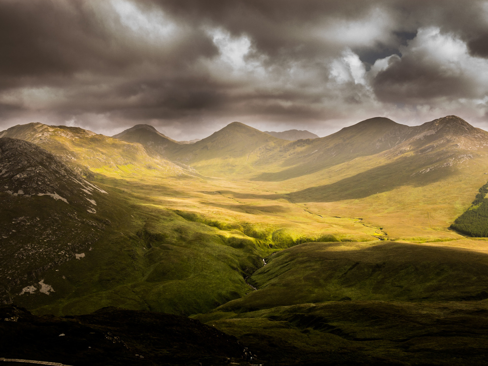Dramatična pokrajinska portretna fotografija z nevihtnimi oblaki, ki se dvigajo nad gorsko verigo, medtem ko sonce osvetljuje dolino spodaj. Temne utišane barve poudarjajo dramatičnost slike in poskrbijo, da fotografija res izstopa. Najbolje se prilega v okvir, ki poudarja globino slike in ne odvrača pozornosti od motiva.