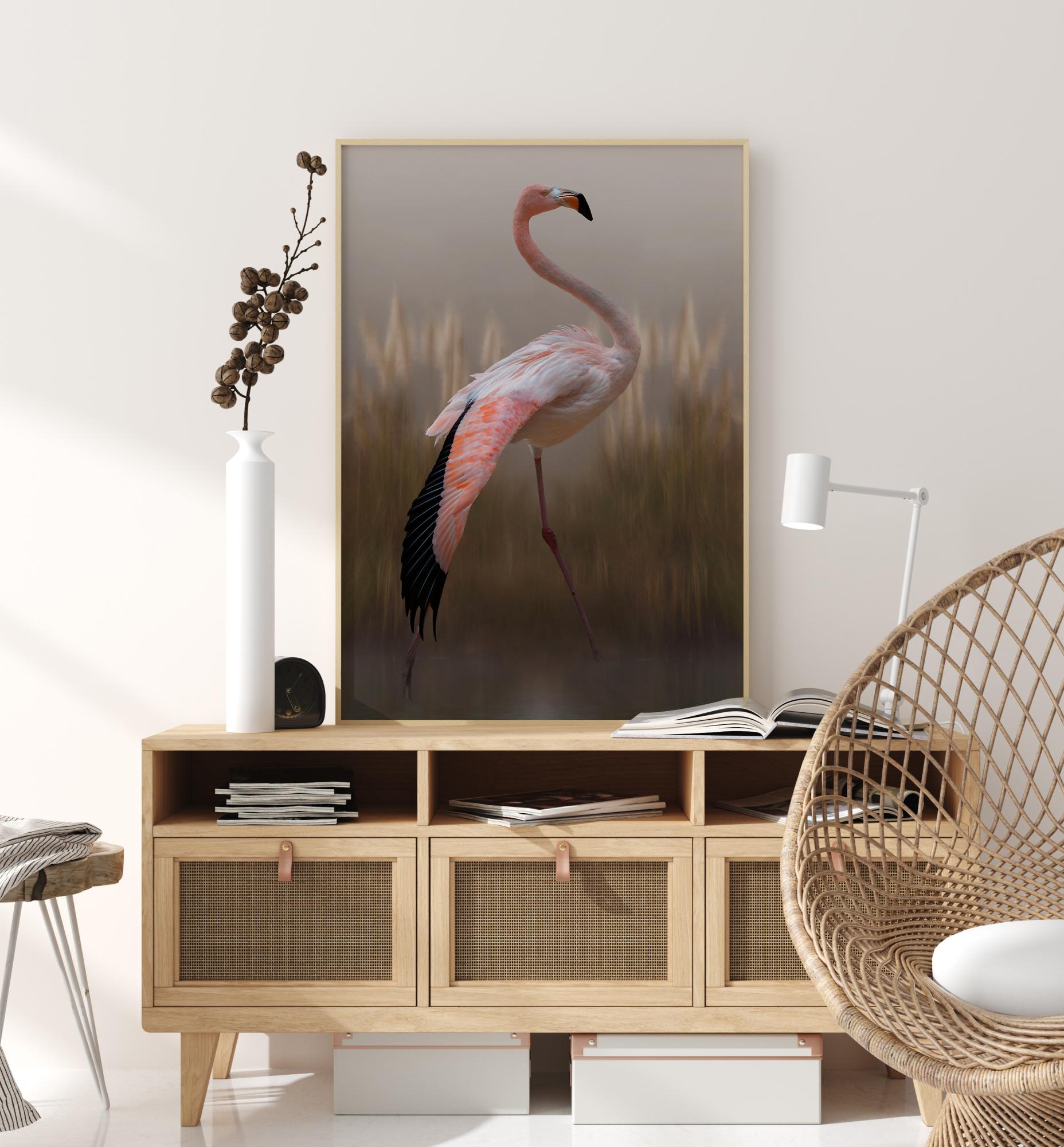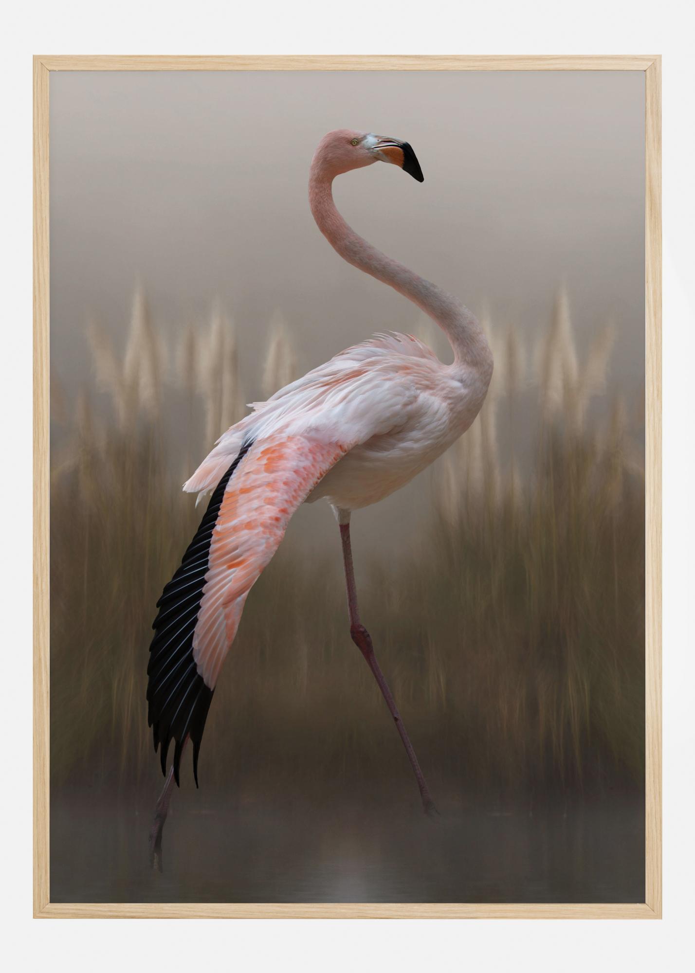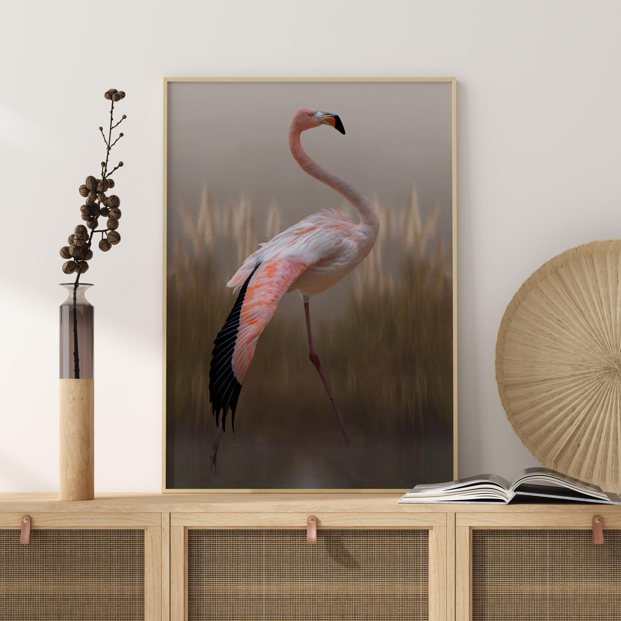 Poster z živalmi s ponosno rožnato flamingo. Barvni toni in zamegljenost fotografije skoraj dajejo občutek slike. Lahko si domišljate, da se sprehajate okoli skupaj s ptico, ko to poster združite s preprosto modro steno.