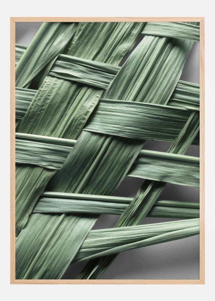Ta stiliziran in naravno navdihnjen poster prikazuje podrobno tkanje zelenih listov, katerih linije se križajo v organiziranem neredu. Živa zelena barva in različne teksture, ki izhajajo iz listov, ustvarjajo pomirjujoč in svež vtis, kar prispeva k občutku prisotnosti narave v notranjosti.