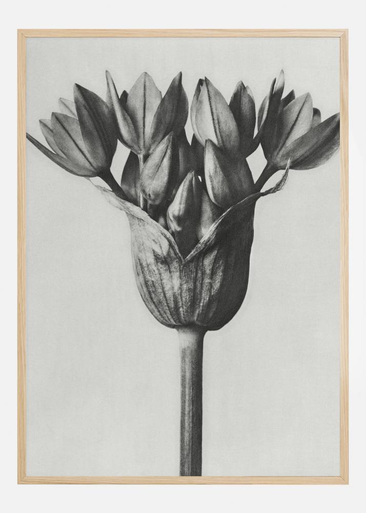 Lepa črno-bela plakat cvetlice, iz katere izhaja veliko manjših cvetov. Predstavlja simbol sreče s svojo eleganco in preprostostjo. Svetlobni in senčni učinki ustvarjajo čudovit odtis na preprostem sivem ozadju. To naredi ta odtis primeren v prostornem okolju, kot je dnevna soba ali spalnica.