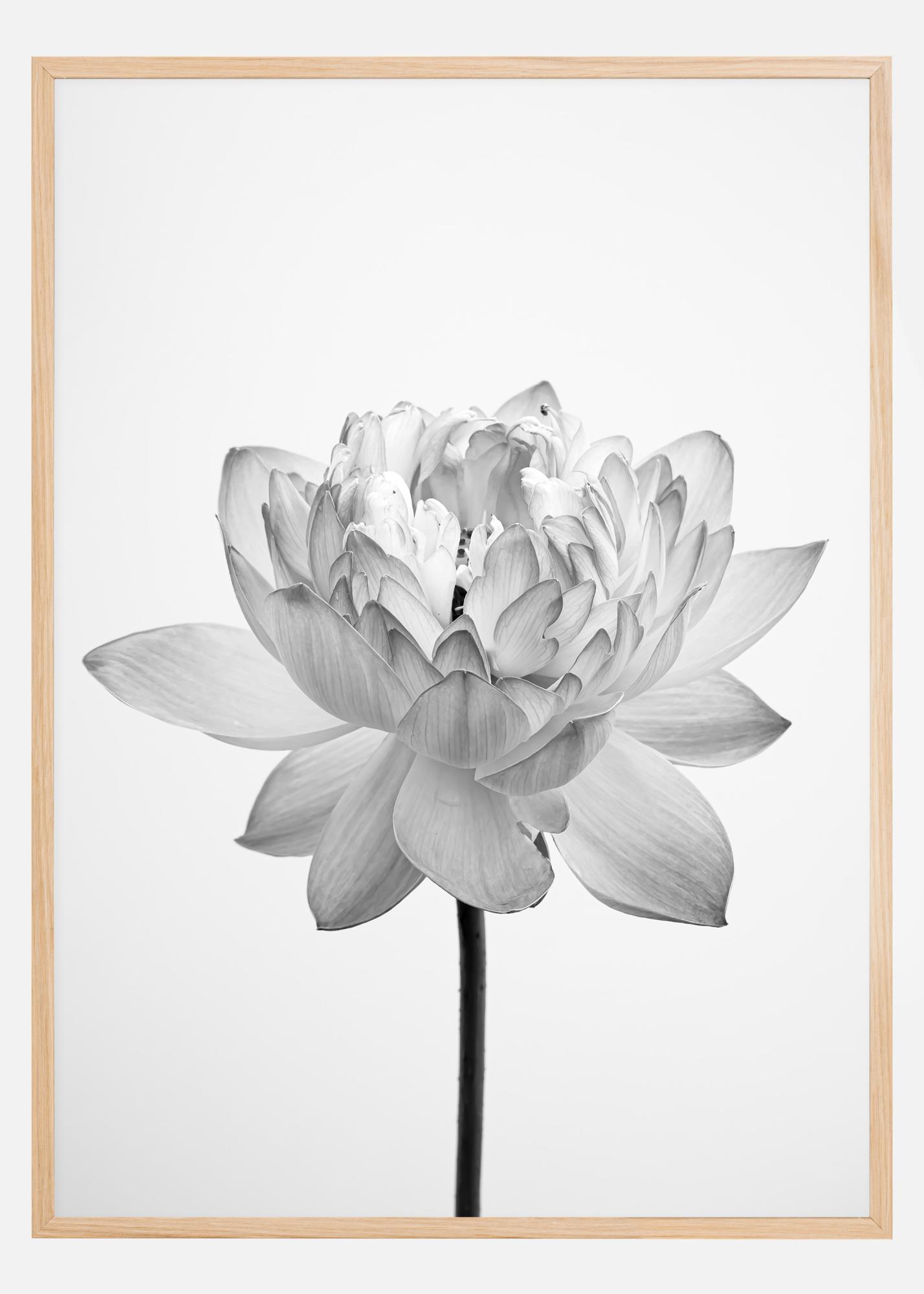 Ta plakat prikazuje brezčasno in elegantno črno-belo sliko cvetlice v polnem razcvetu. Podrobno prikazana vsaka lističa prikazuje umetniško delo narave in ponuja skoraj meditativno opazovanje. Ta preprost, a močan prikaz je študija oblike, svetlobe in sence, ter kako ti elementi delujejo skupaj za poudarjanje lepote naravnega sveta.