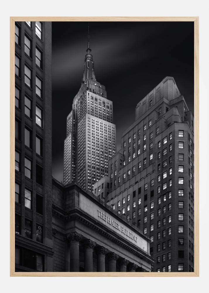 Plakat s stavbo Haier v New Yorku ponoči. Svetleče zlate črke stavbe osvetljujejo napis "The Haier Building". Z zgradbami proti črnemu mestnemu obzorju je to zelo izstopajoča slika. Ta dramatičen črno-beli plakat notranjosti New Yorka je popoln na beli steni.