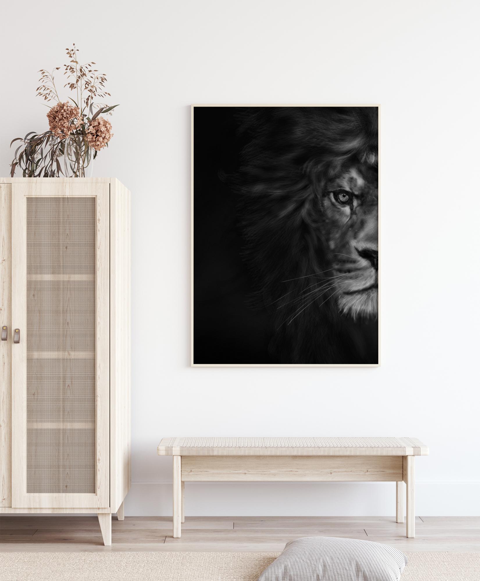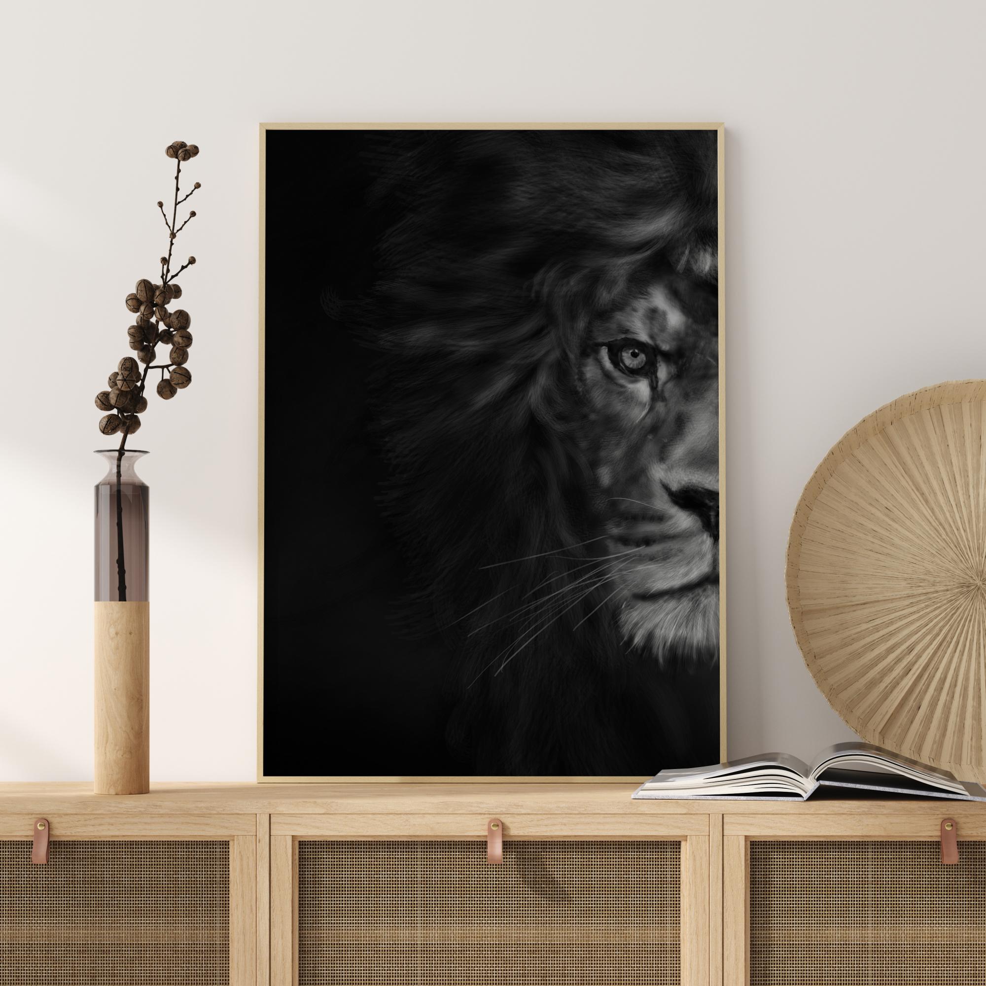 Impresiven črno-bel plakat narave z divjim levom, ki zre naravnost v kamero. Na desni strani odtisa je vidna le polovica levovega obraza. S svojo čudovito valovito grivo in veličastno pozo je brez dvoma lahko opredeljen kot kralj džungle. Prinesite safari občutek v vaš dom.