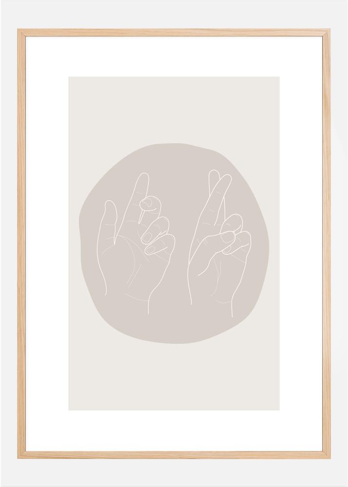 Preprost plakat z dvema levima rokama proti okrogli bež obliki. Krog je postavljen na kožno obarvano ozadje z obema rokama, ki kažeta proti zgornjemu robu plakata. Roki sta sproščeni in ustvarjata mirno vzdušje v vašem domu. Popolna slika za vašo delovno sobo.