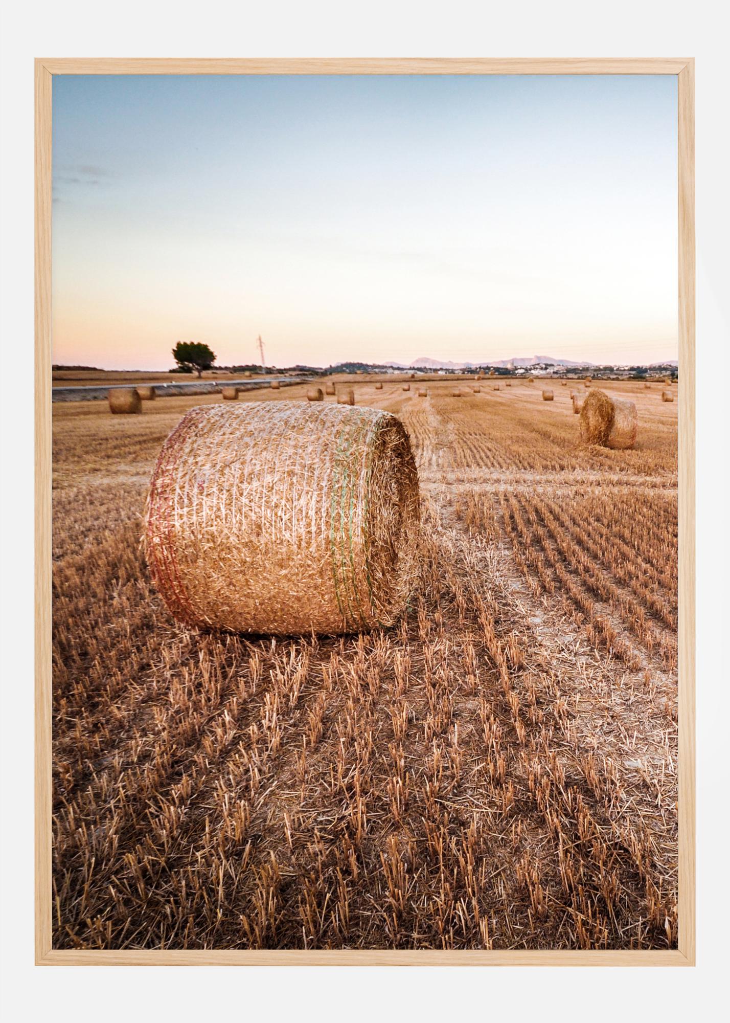 Preprost a lep plakat z naravno motiviko. Kup sena v ospredju je lepo zvit, v ozadju pa so vidni drugi zviti kupi sena razporejeni po poljih. Svetlo modro nebo in tople rjave barve ustvarjajo toplo in sproščujočo sliko, ki jo lahko obesimo v rustikalno kuhinjo.