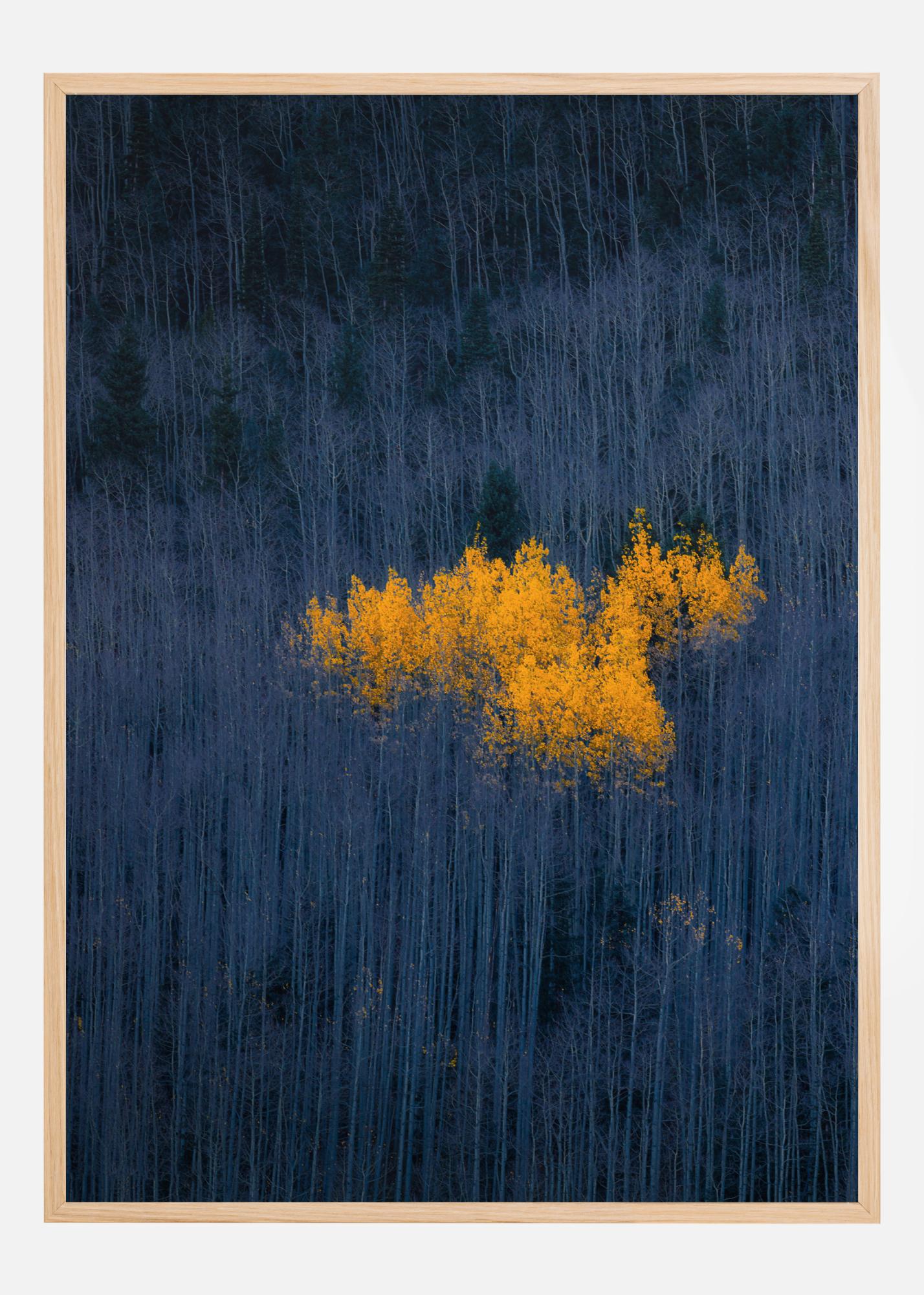 Čudovit plakat, ki prikazuje temno zeleno in barvo nočnega neba. Na sredi tiska so vrhovi dreves poudarjeni z rumeno barvo, kar daje tisku nekaj barve. Lep tisk za obešanje v dnevni sobi, da ustvarite sproščujoče vzdušje.