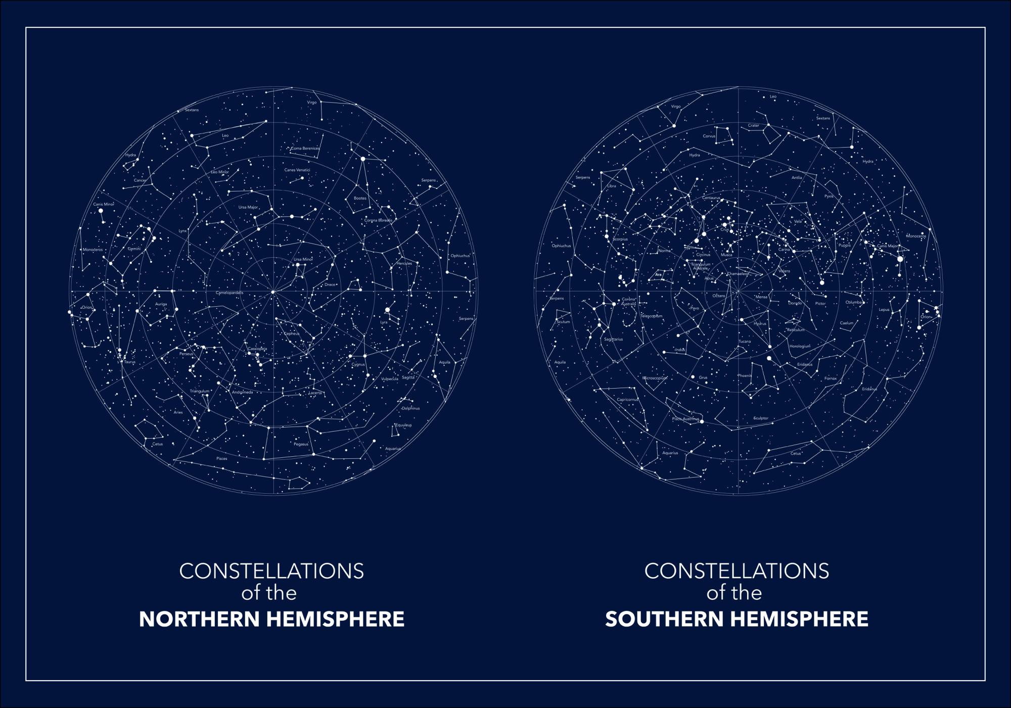 Očarljiv temno moder poster s severnim in južnim zvezdnatim nebom. Obe sliki sta postavljeni drug ob drugem. Na temno modrem ozadju so ozvezdja nežno obrobljena z belo. Obešajte to sliko v vaši delovni sobi, da ustvarite občutek neskončnosti.