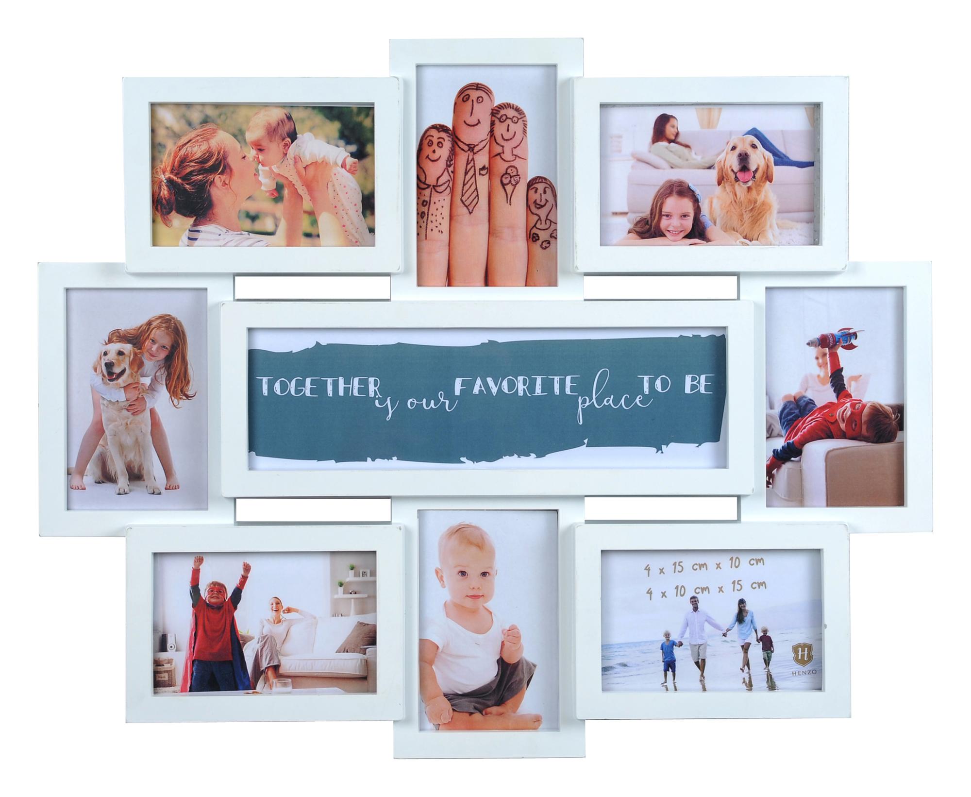 Zberite svoje najlepše fotografije v elegantnem okvirju za kolaže! Ta okvir ni le lep na pogled, ampak ga lahko tudi preoblikujete! Priloženih je namreč 5 kosov prikupnih besedil z različnimi temami, ki jih namestite v sredinski (9.) okvir in jih zamenjate, kadar se vam zahoče. Na primer, lahko vstavite besedila kot "Vse, kar potrebuješ, je ljubezen" ali "Reci da družini". Okvir za kolaže je na voljo v črni in beli barvi.
