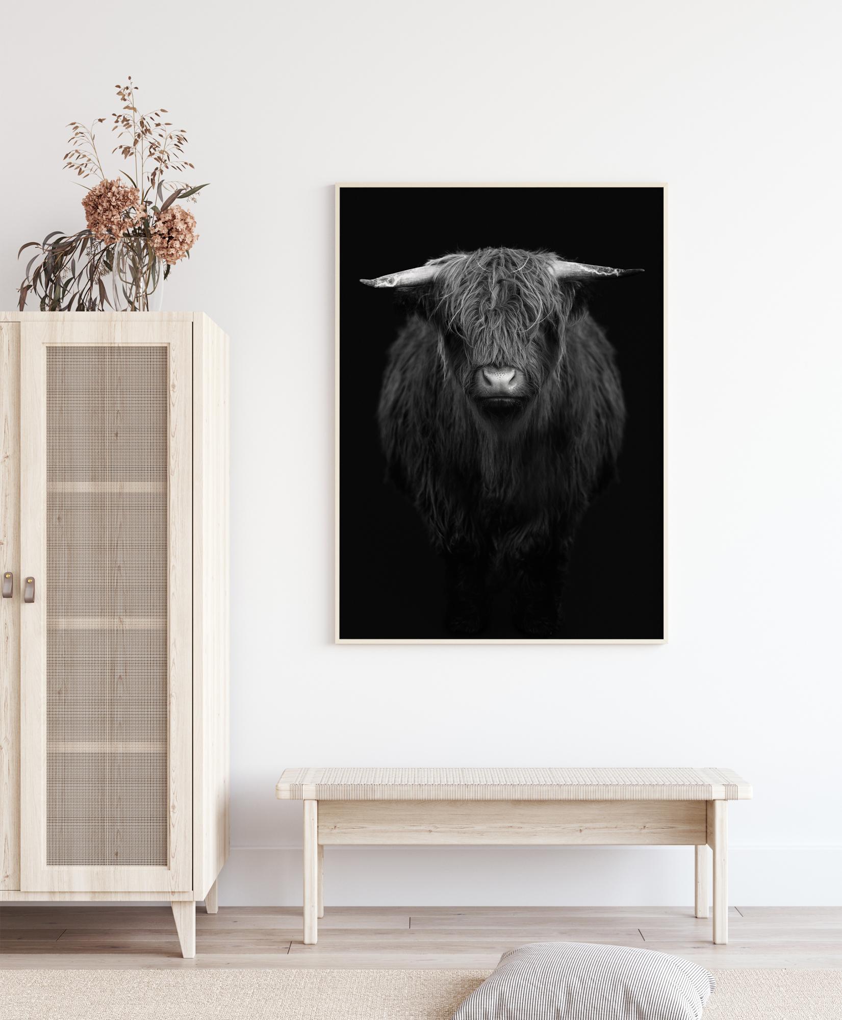 Impresivna črna višavska krava proti črnemu ozadju. To lepo bitje gleda naravnost v kamero in razkazuje svoj dolgi črni valoviti plašč. Čeprav je ta poster črno na črnem slika, so krave beli rogovi in nos jasno vidni. Občudujte lepoto tega bitja, ko strmi v kamero.