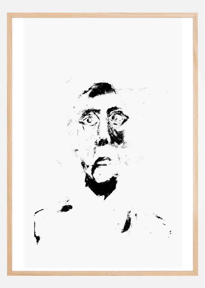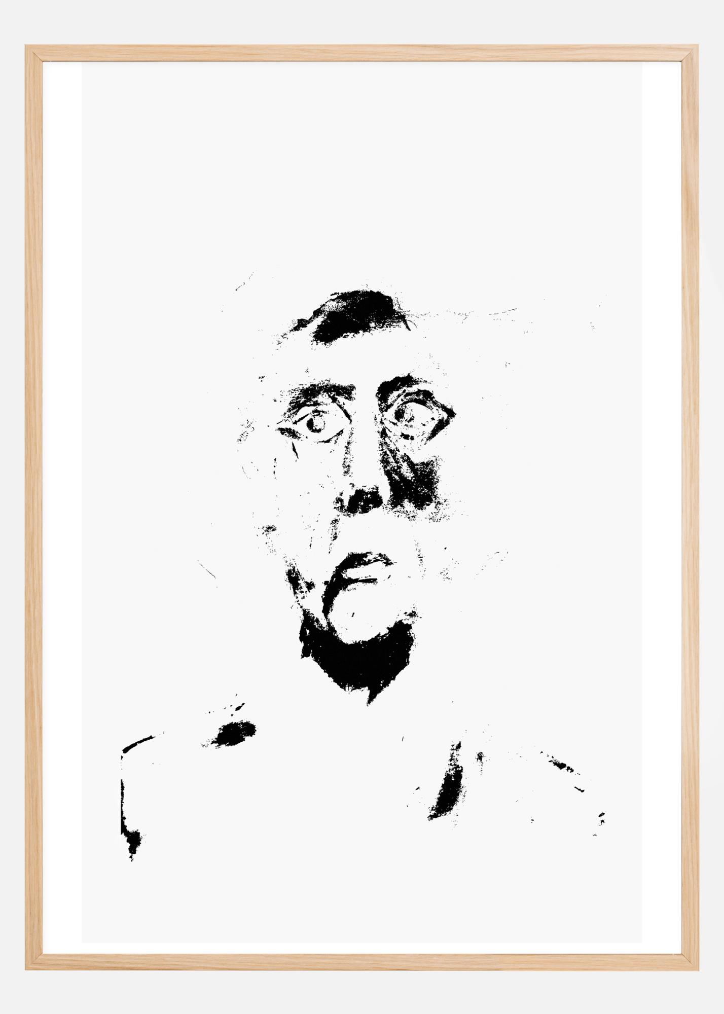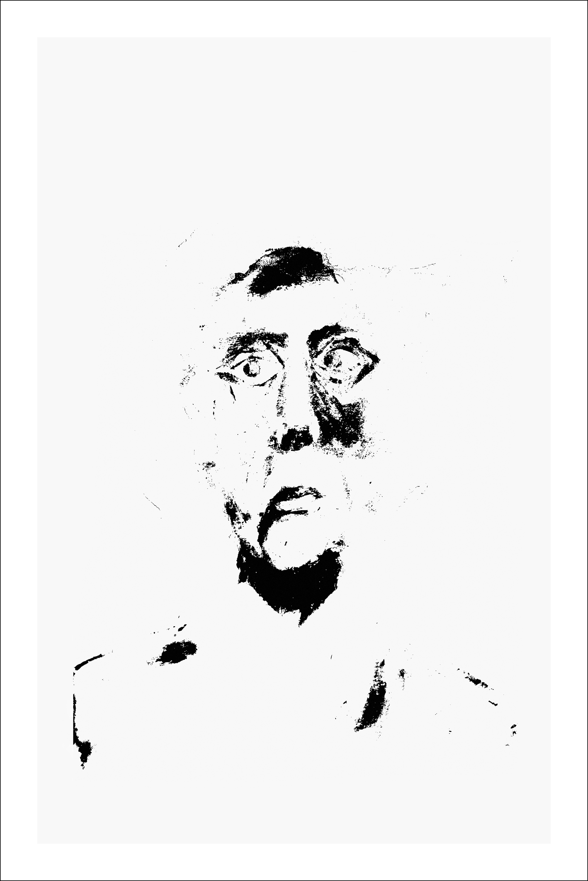 Srhljiv črno-beli portret z glavo in rameni. Na beli podlagi poudarjajo temni odtenki lase, lice in vrat osebe. Osebine velike oči izražajo strah in skrivnostnost. Žalostna in srhljiva slika, ki prenaša strašljiv občutek.
