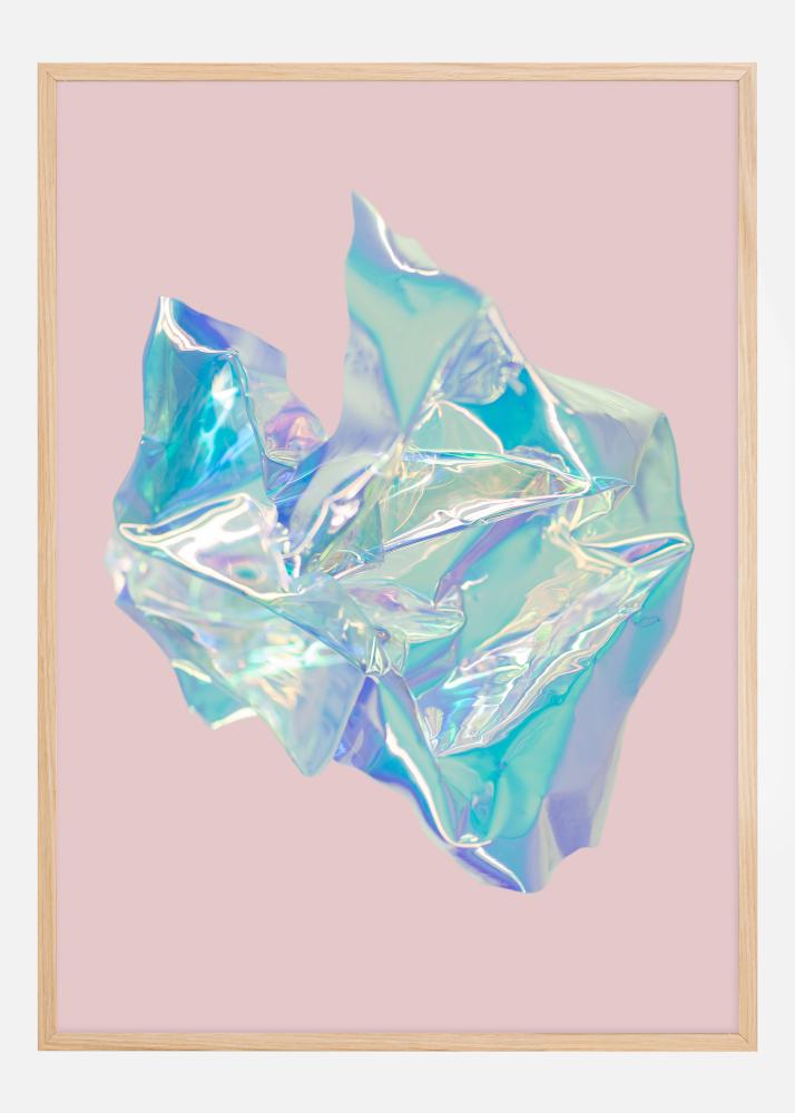 Ta poster je poklon sodobnemu in eksperimentalnemu, kjer nagubana holografska folija leži proti mehki roza ozadju. Njene odsevne površine se lesketajo v spektru pastelnih barv, ki prehajajo iz akvamarin modre v mehko sivko in rožnato roza. Ta print je popolna metafora za prožnost in spremembo ter se odlično poda v sodoben interier, ki ceni edinstvene, misel vzbujajoče detajle.