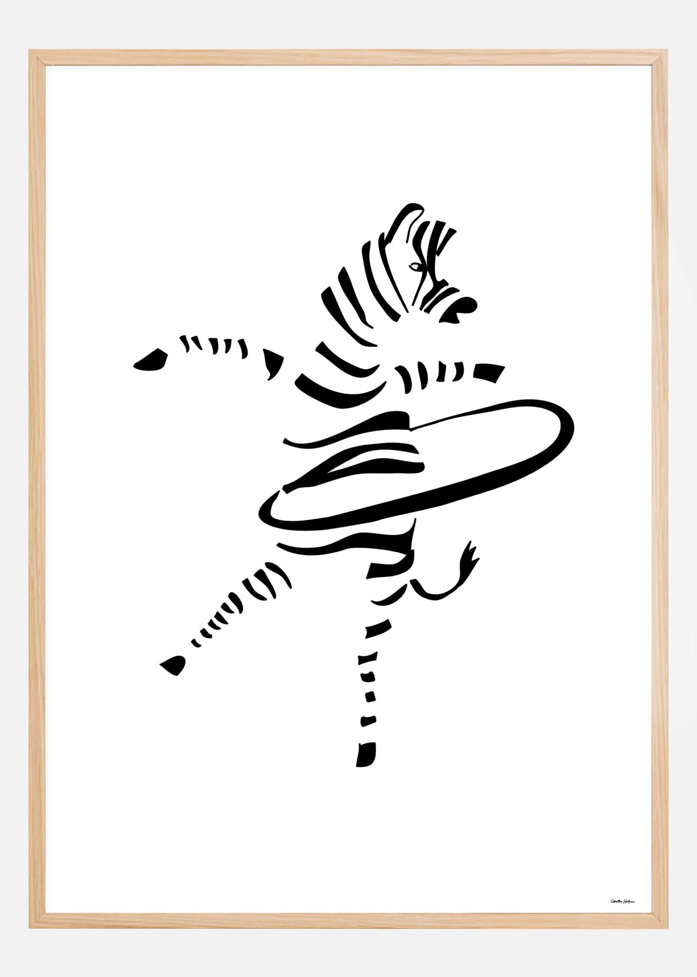 Minimalistični portret plešoče zebre. Na beli podlagi črne poteze s čopičem spretno oblikujejo podobo zebre. Ta ljubka zebra stoji na zadnjih nogah in pleše s hulahup obročem. Preprost, a zabaven poster za obešanje na preprosto steno.