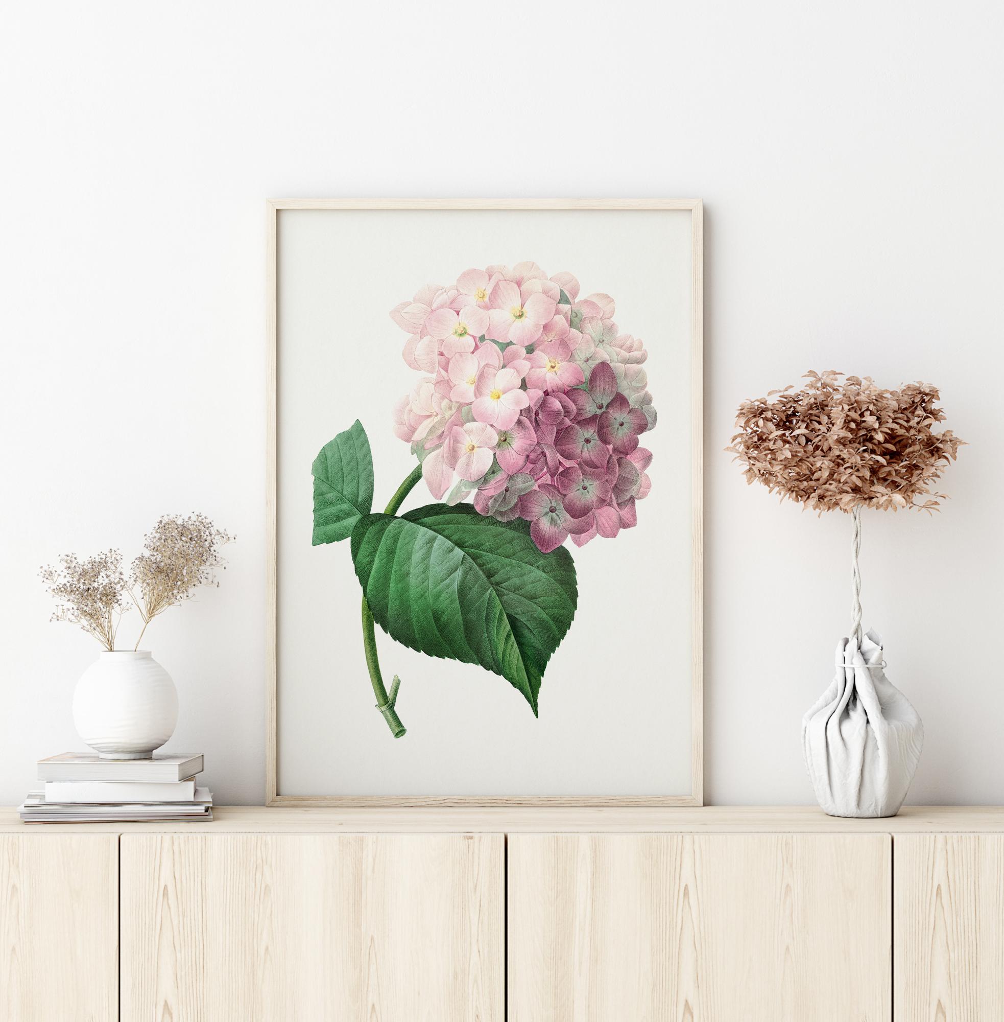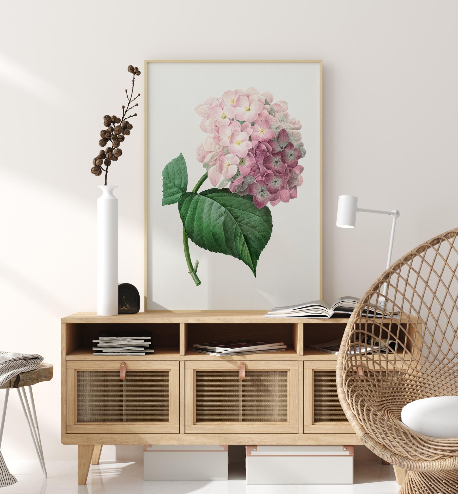 Cvetlični plakat s hortenzijo. Mehko rožnati venčni listi z mehkim zelenim steblom in zelenim listom dominirajo na sredini slike. Na čisti beli podlagi ta lepa, toda občutljiva roža daje občutek miru in spokojnosti. Obešajte to sliko v zimski vrt za dodaten pridih elegance v prostoru.