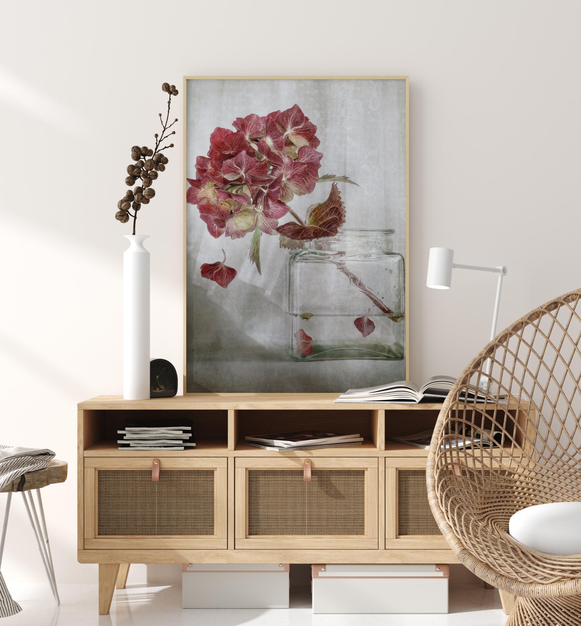 Lepa poster z naravo s steblom hortenzije v prozorni vazi. Pred cvetličasto belo zaveso pade nežno roza cvetni list. Zavesa plapola v lahkem vetriču. Ta slika te skorajda opomni na sapo vetra.