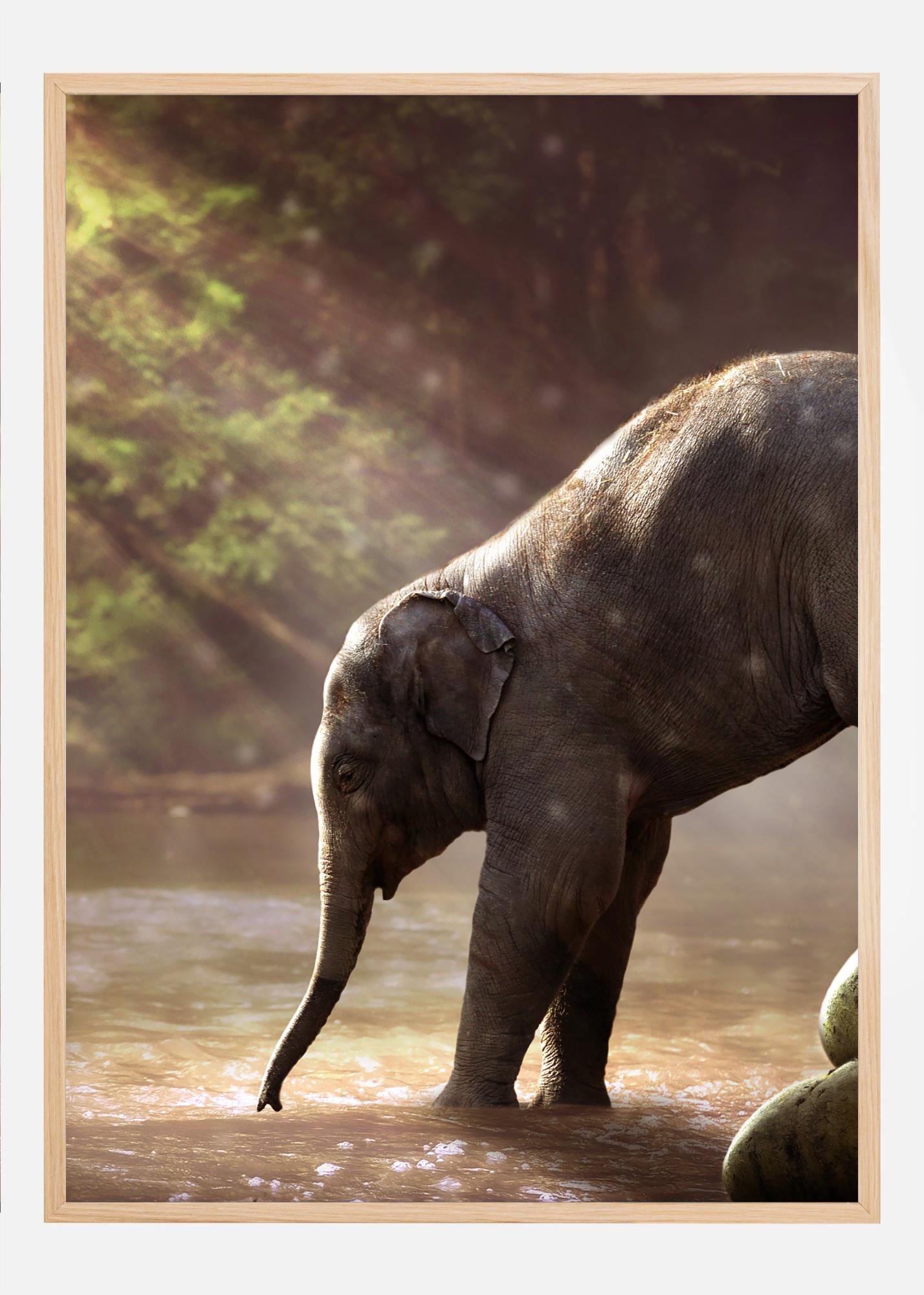 Sladka fotografija mlade slončice, ki jo mama spodbuja, da se spusti v reko. Dnevna svetloba sije skozi drevesa in se odseva v vodi, kar ustvarja občutek topline. Slončica okleva pri vstopu v vodo, vendar ji mama nežno pomaga. Ta sladka plakat odraža intenzivno ljubezen med materjo in otrokom.