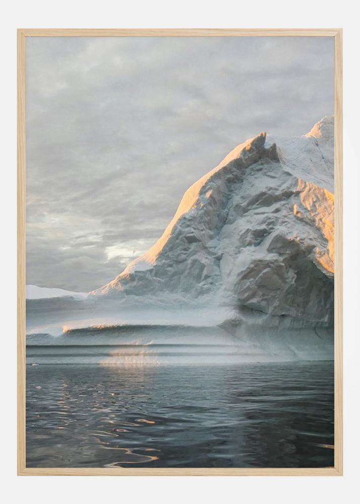Ta osupljivi poster odraža ledeno goro v globokem, hladnem morju proti oblačnemu sivemu nebu. Majhen sneg prekriti hrib je delno osvetljen s sončno svetlobo. Kristalno modro morje se nežno giblje v ospredju in ustvarja mirno podobo. Popolna slika za obešanje nad kaminom v vaši zimski koči.