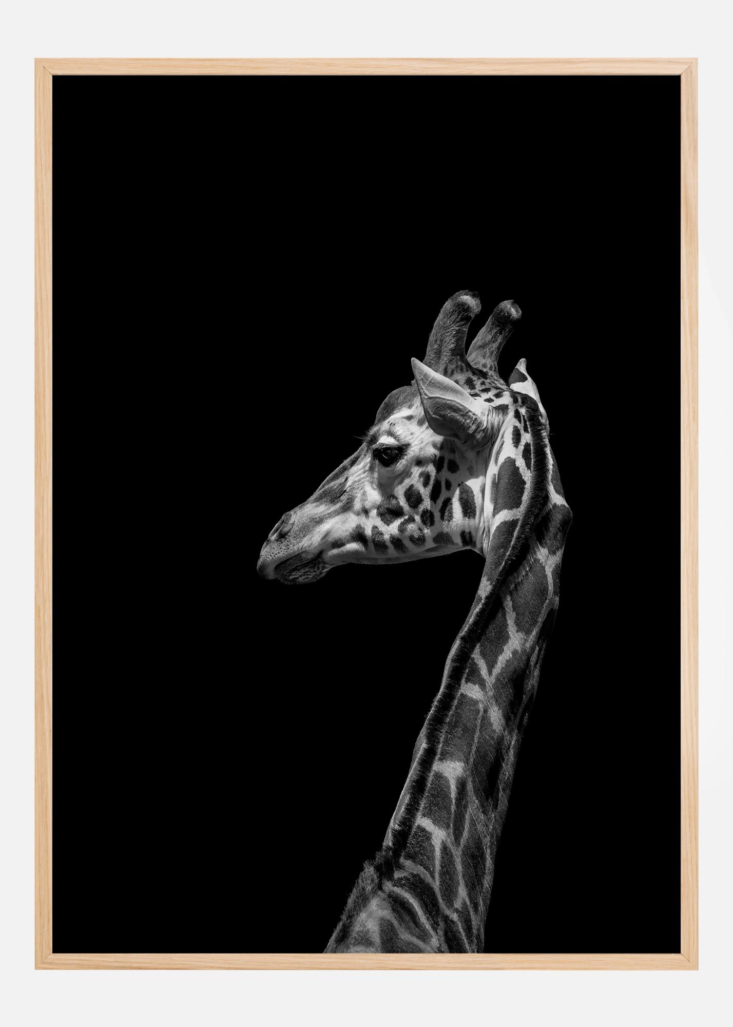 Ta drzna in izrazita poster prikazuje veličastno žirafo na črnini, kar ustvarja dramatičen kontrast, ki ujame pogled opazovalca. Edinstven vzorec žirafe v sivini je mojstrsko ujet, vsaka pega in linija sta poudarjeni v detajlih. Podrobna tekstura kože žirafe in mehki odtenki sive proti črnemu ozadju ustvarjajo skoraj tridimenzionalni učinek.