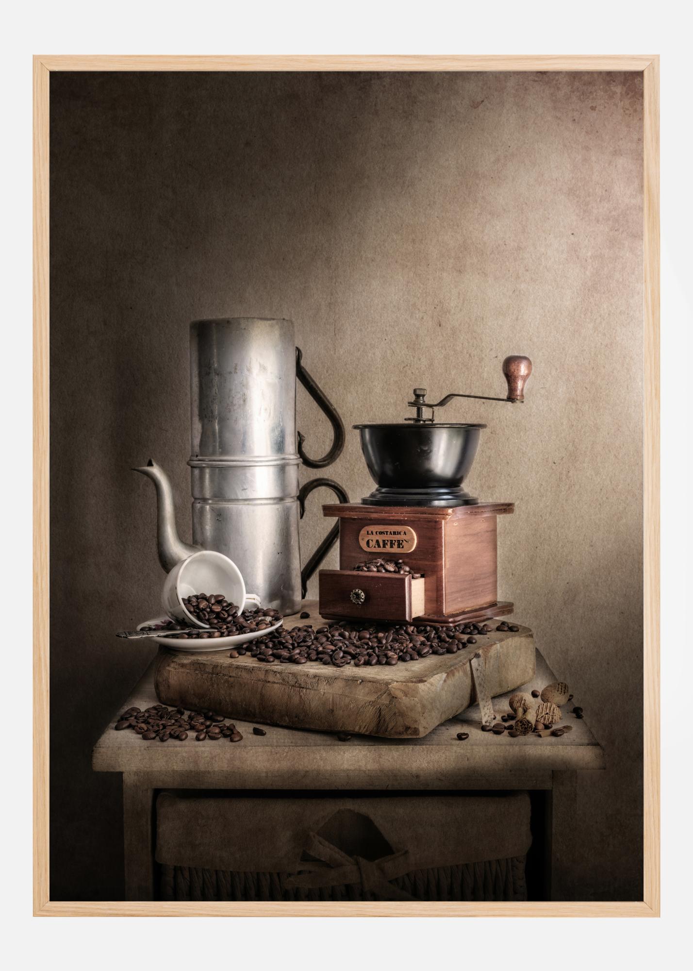 Grafika s temo kave z mlinčkom za kavo, džezvo, kavna zrna ter belo skodelico in krožničkom. Mehki rjavi toni na tej grafiki ustvarjajo sproščujočo podobo, kjer lahko skoraj zavohate čudovita pražena kavna zrna. Popolna slika za obešanje v vaši kuhinji.