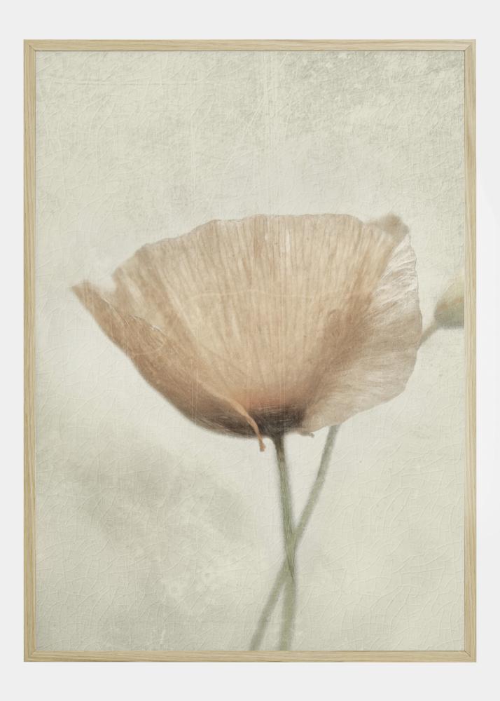 Čudovit naravni plakat z enim samim breskovo obarvanim makom na bež ozadju. S svojimi široko odprtimi nežno obarvanimi cvetnimi listi daje občutek miru in spokojnosti. Prosojnost cvetnih listov razkriva črno notranjost cveta. Izrazita slika, ki je primerna za obešanje na bledo obarvano steno.
