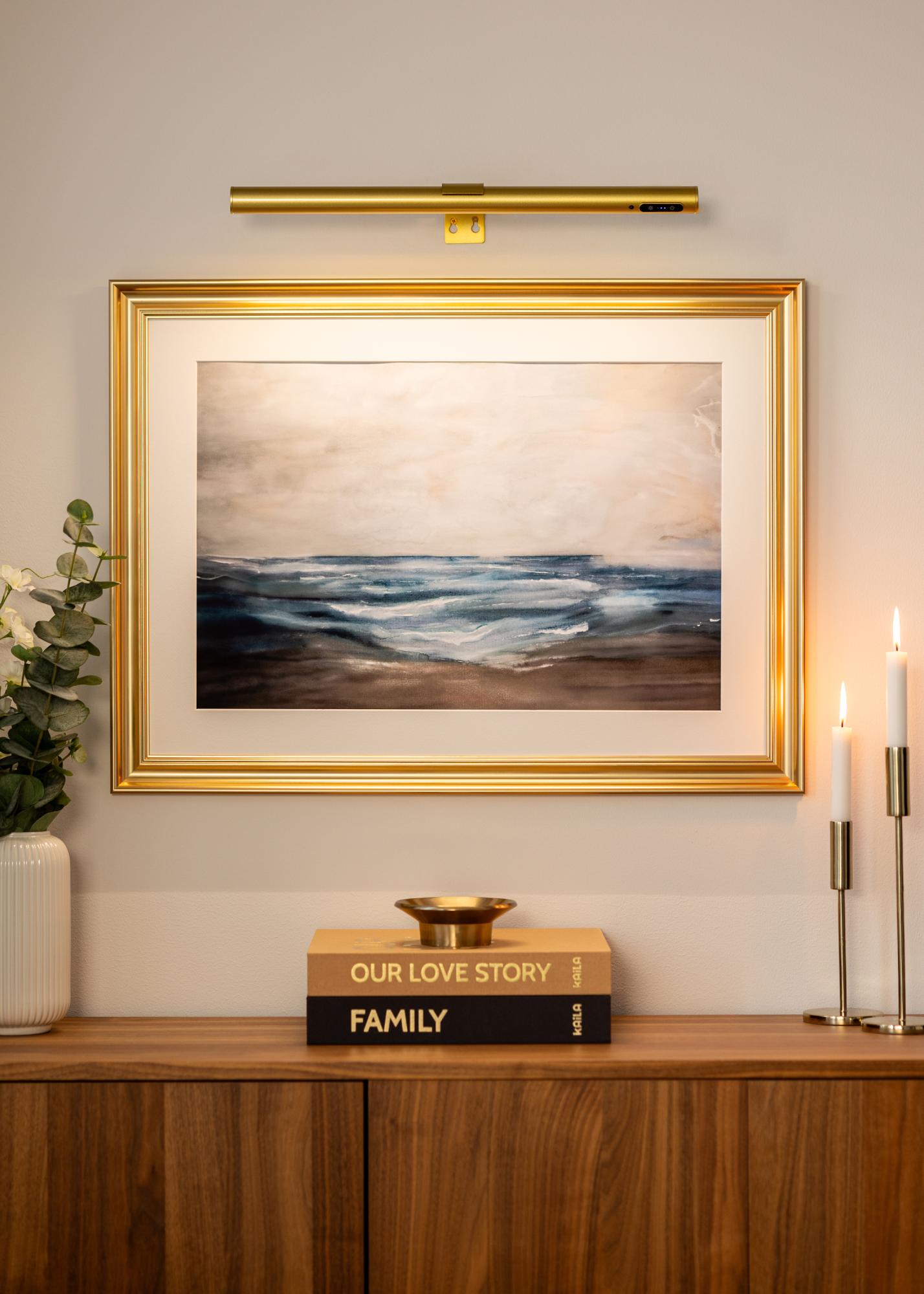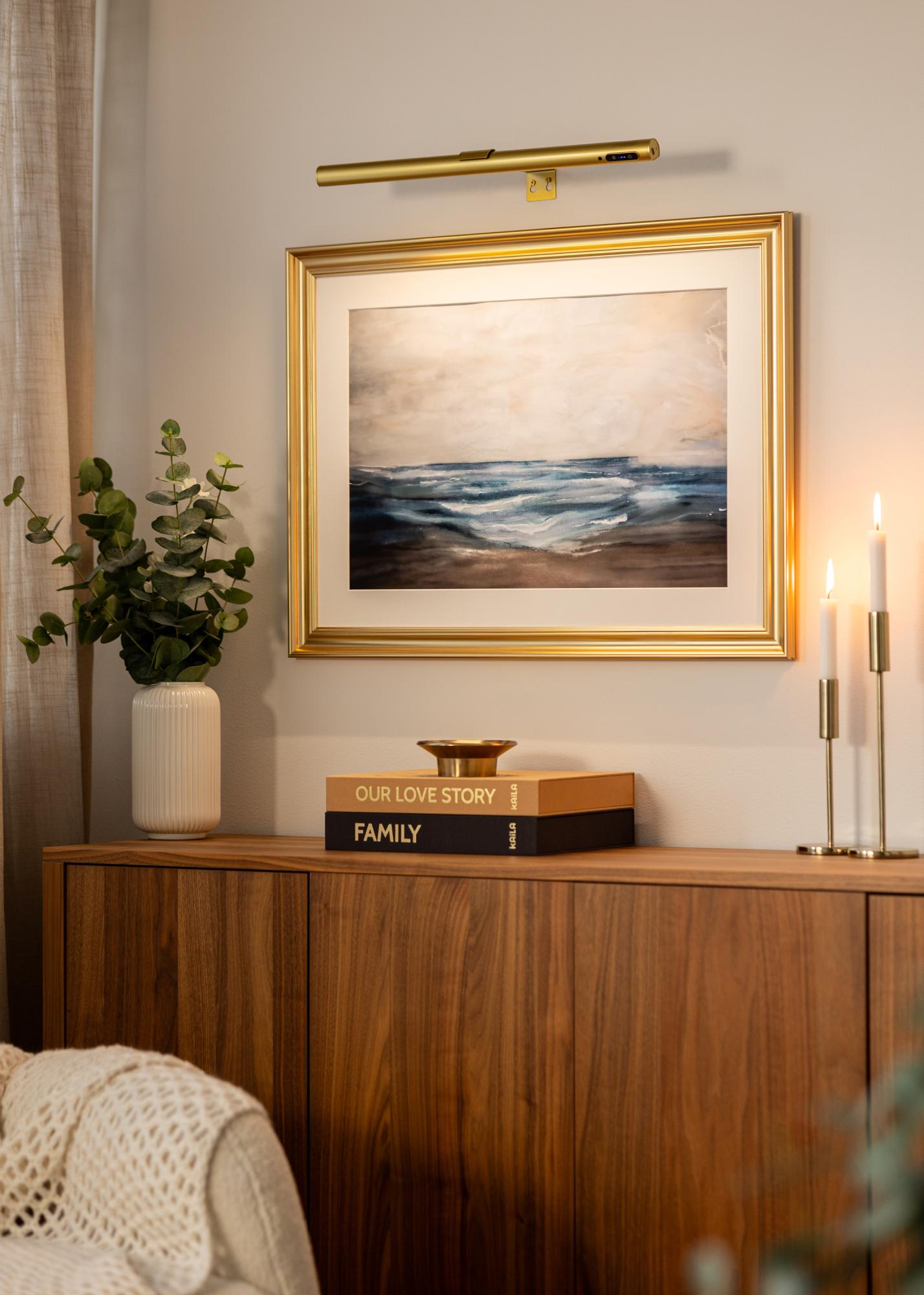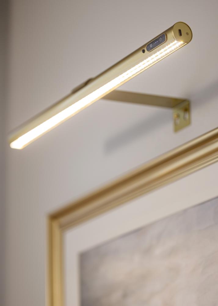 KAILA Halo je eleganten in baterijsko napajan osvetljevalec slik v zlati barvi, popoln za osvetlitev vaših umetniških del brez motečih kablov. Zahvaljujoč brezžični zasnovi ga lahko postavite kjerkoli, ne da bi morali upoštevati električne vtičnice. Eleganten zlat zaključek daje ekskluziven izraz, medtem ko se svetloba enakomerno razprši, da poudari podrobnosti in barve na lep način. Preprost za montažo in enostaven za uporabo – praktična rešitev za dajanje vašim slikam pozornosti, ki si jo zaslužijo.