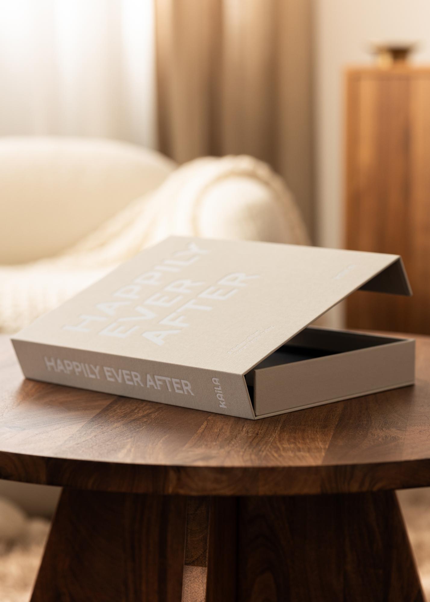 KAILA Happily Ever After je ekskluzivni in eleganten poročni album v elegantni kremasti barvi. Oblikovan je kot coffee table album, kar ga naredi za čudovit dekorativni element, hkrati pa ohranja vaše najbolj nepozabne trenutke. Album vsebuje 60 črnih, kislinastih strani, na katere lahko na stilni način pritrdite svoje poročne fotografije. Popoln za ustvarjanje brezčasne zbirke spominov na veliki dan.