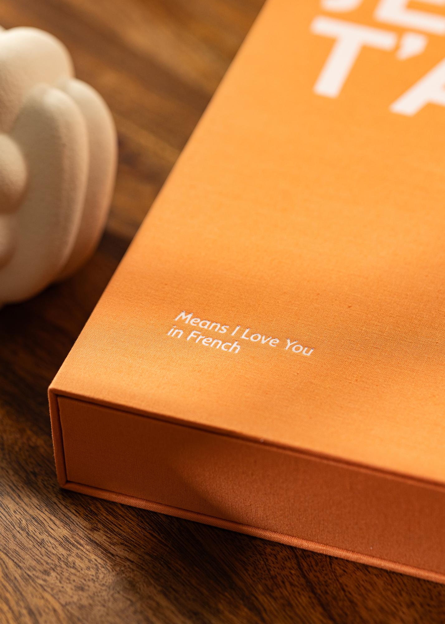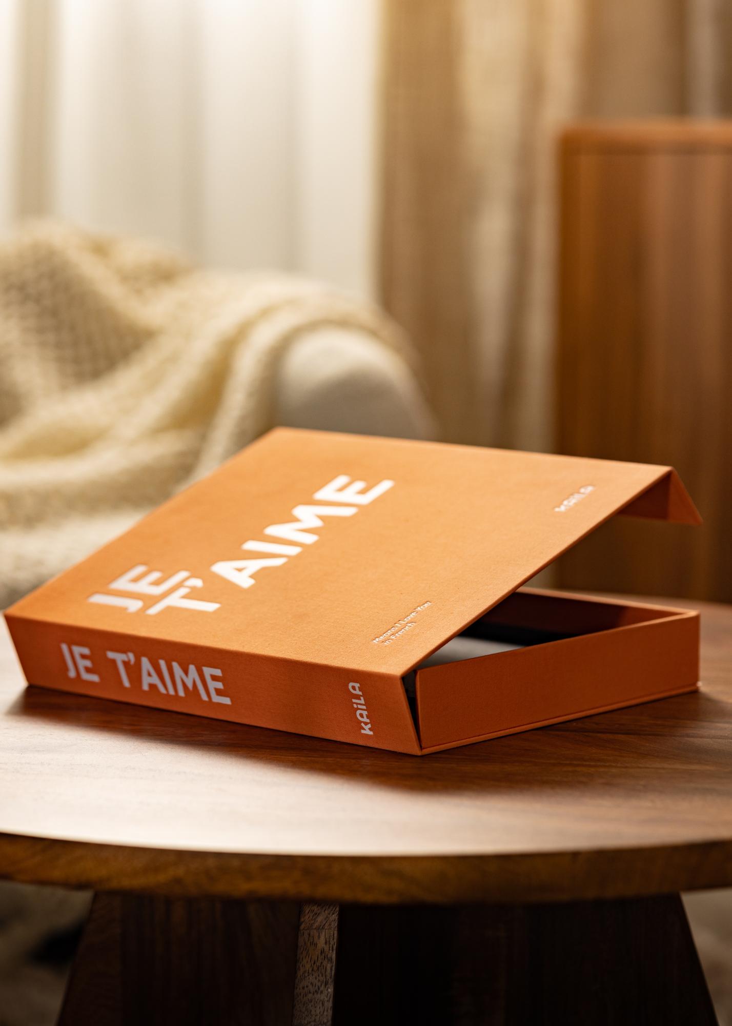 Ta album Coffee Table ponuja stil, razkošje in romantiko. Ekskluzivna zasnova je oblikovana kot škatla s tekstilno prevleko v elegantni oranžni barvi. Ovoj je okrašen z belim napisom z besedno zvezo »JE T'AIME«, ki ji sledi opisni podnaslov v obliki »Means I Love You in French«. V notranjosti je lepo okrašen notranji ovoj ter 60 črnih albumskih strani (30 listov). Ker sami lepite svoje slike v album, imate možnost biti kreativni.