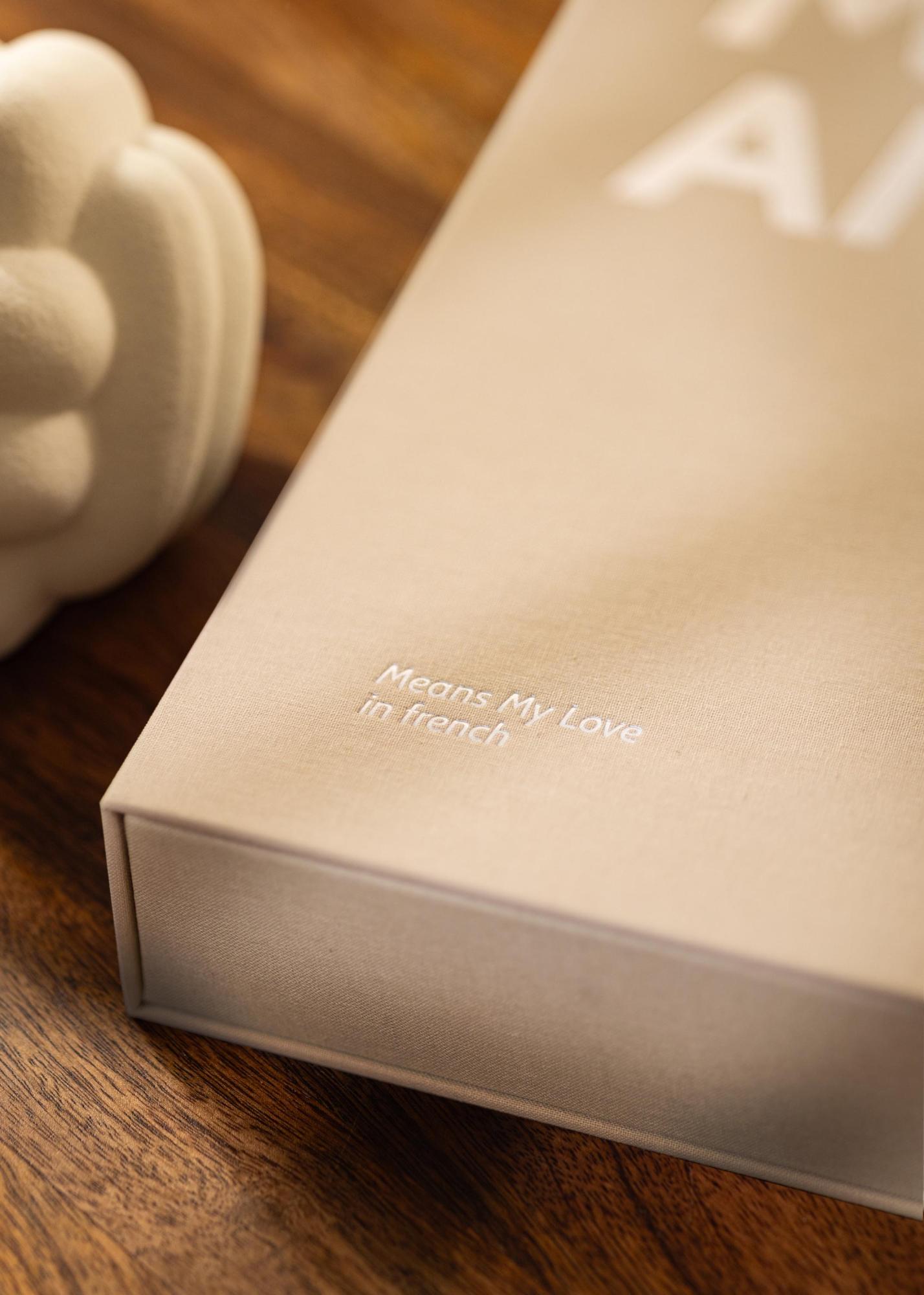 Ali želite sodoben foto album, ki deluje kot razkošen dodatek k vaši domači dekoraciji? Potem je ta Coffee Table Album nekaj za vas! Album je oblikovan kot majhna škatla z ekskluzivno bež tekstilno platnico. Naslov albuma "MON AMOUR" dodaja romantičen pridih sicer minimalističnemu izrazu. Podnaslov v levem kotu albuma se glasi "Pomeni Moja ljubezen v francoščini".