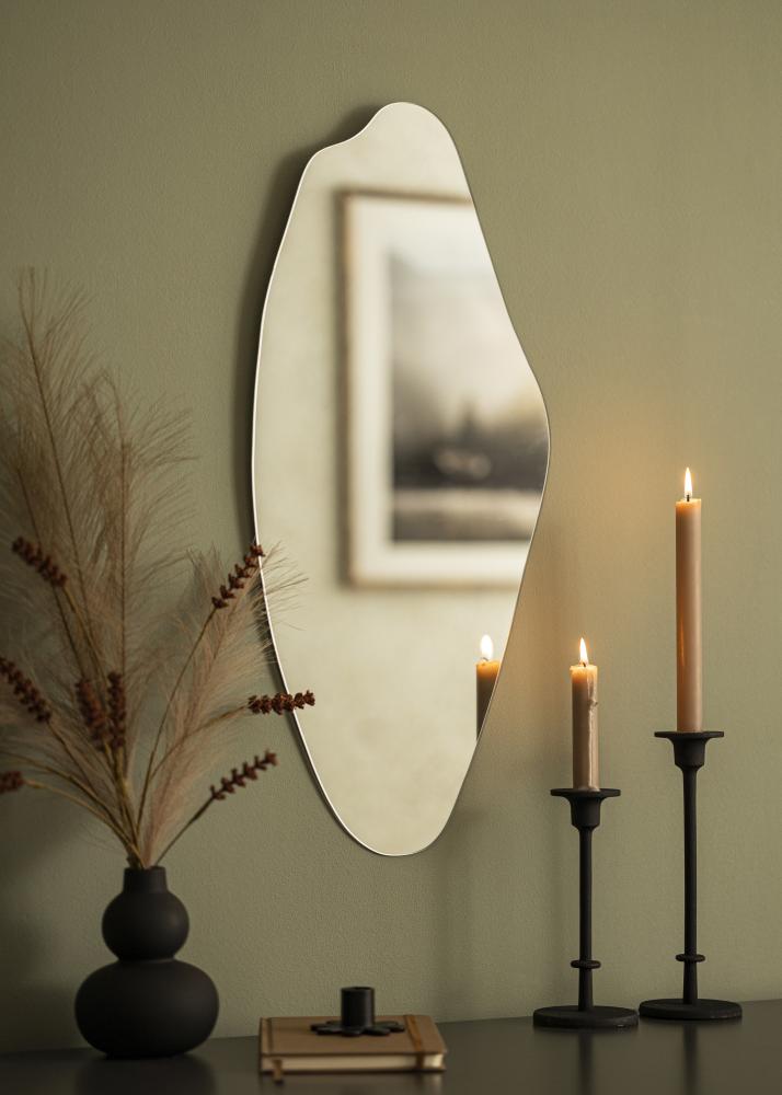 To je podolgovato ogledalo z lepo asimetrično obliko, kar ga naredi za vznemirljiv notranji detajl, ki se odlično prilega modernemu domu. Ogledalo ima praktične stenske nosilce na hrbtni strani in se obesi na steno v prostor, ki si ga želiš – primerno je celo za uporabo v kopalnici!