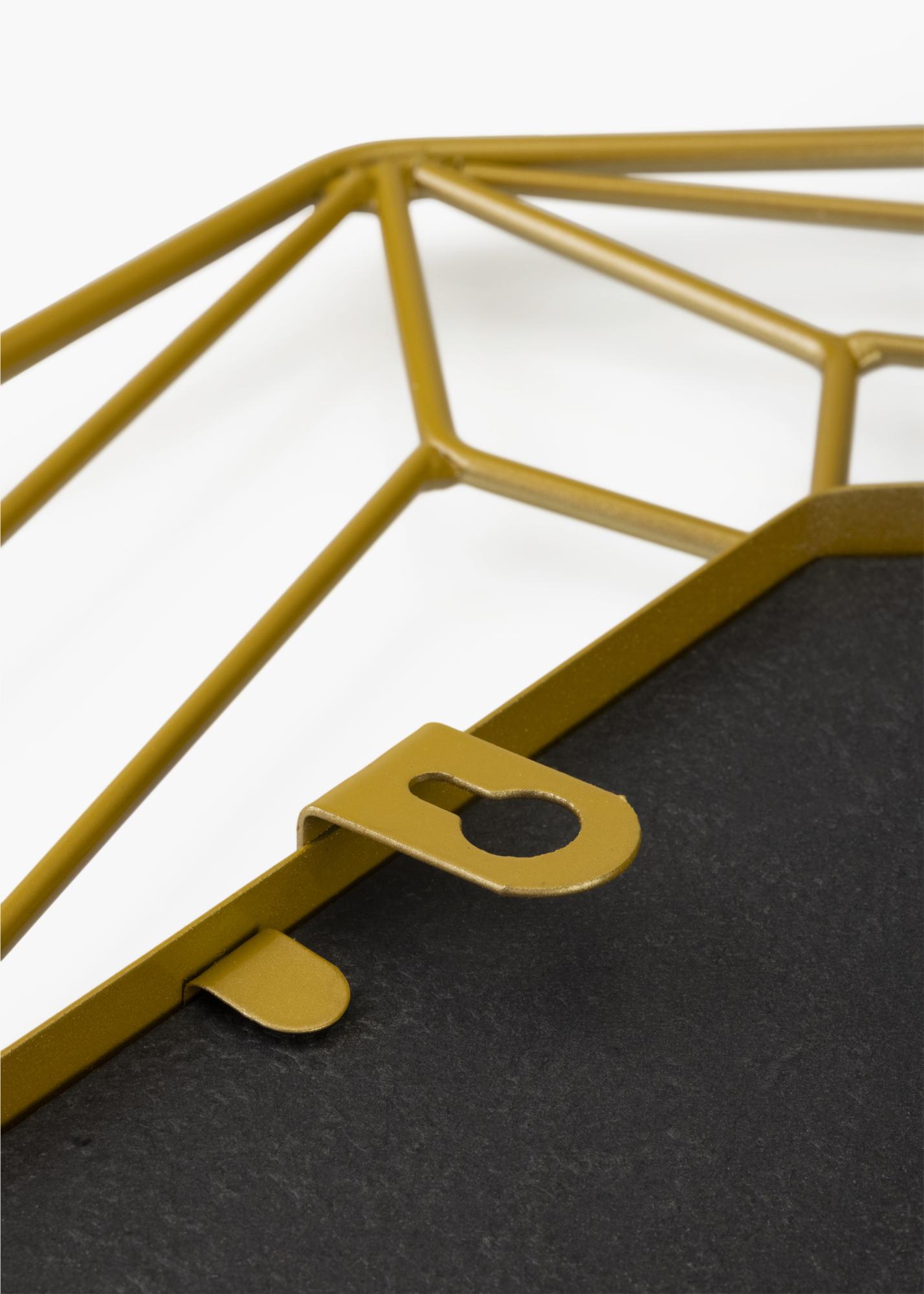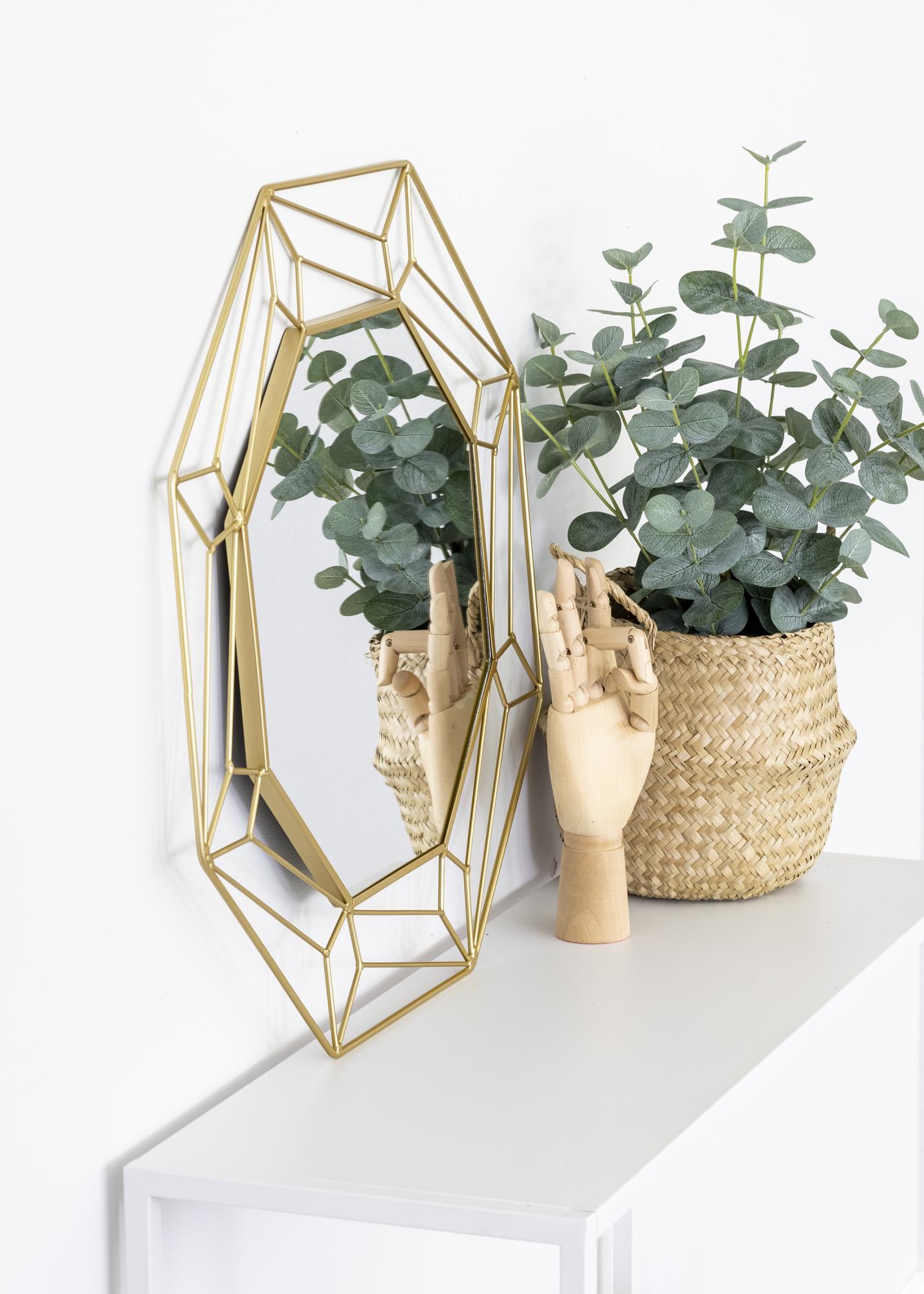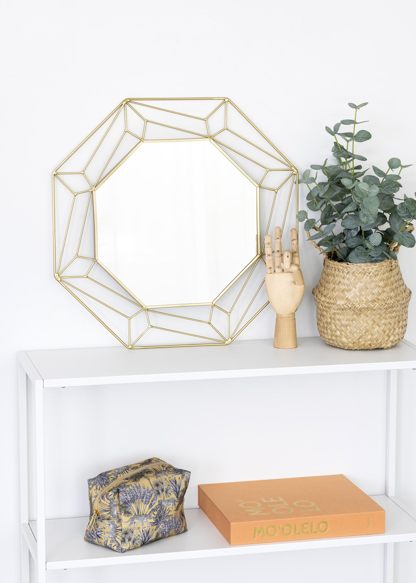To je ogledalo v elegantnem abstraktnem dizajnu iz KAILA! Okrog šestkotne zrcalne površine v sredini gre rob iz medeninasto obarvane kovine, ki tvori eleganten vzorec. Zlati odtenek daje temu ogledalu luksuzen pridih, zaradi česar je še posebej primerno za tiste, ki želite imeti elegantno in stilsko urejen dom! Ogledalo meri 50x50 cm in je izdelano iz kovine. Na zadnji strani ogledala so stenski nosilci.