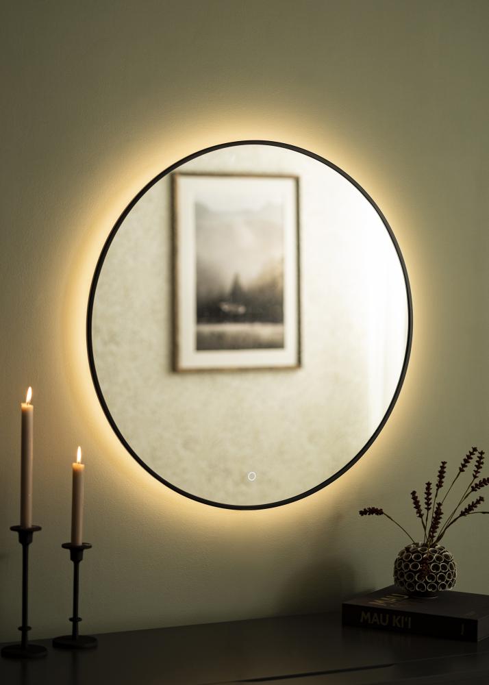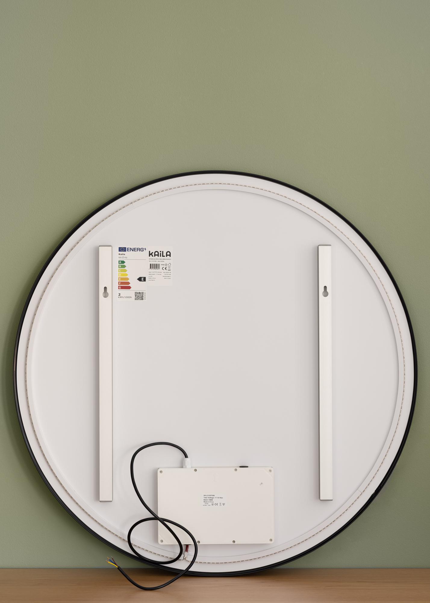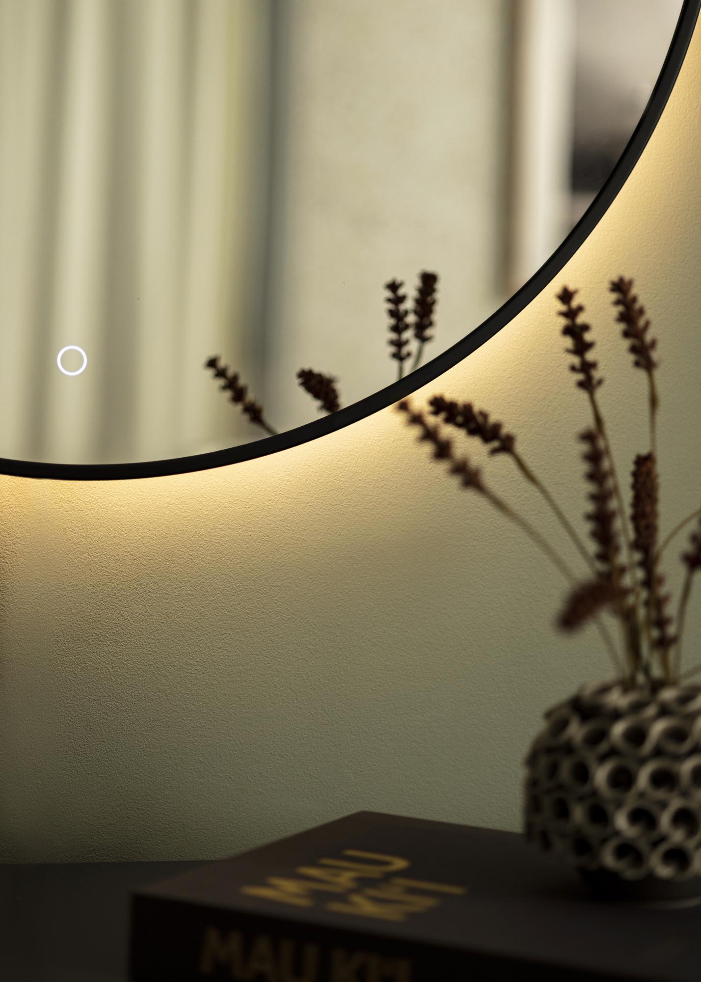 To je elegantno ogledalo z LED osvetlitvijo, ki je prav tako lepo v hodniku kot v kopalnici. Ogledalo ima klasično okroglo obliko in kovinski okvir v sofisticirani črni barvi. Ogledalova integrirana LED osvetlitev s 3000K je zatemnjena od 10% do 100% svetlosti. To vam omogoča, da enostavno nastavite osvetlitev na želeno svetlost in jo spremenite, če se vaše potrebe spremenijo. Za zatemnitev svetlobe držite gumb na dotik na spodnjem delu površine ogledala nekaj sekund. LED osvetlitev je nameščena na zadnji strani ogledala, kar daje svetlobi mehkejši videz.