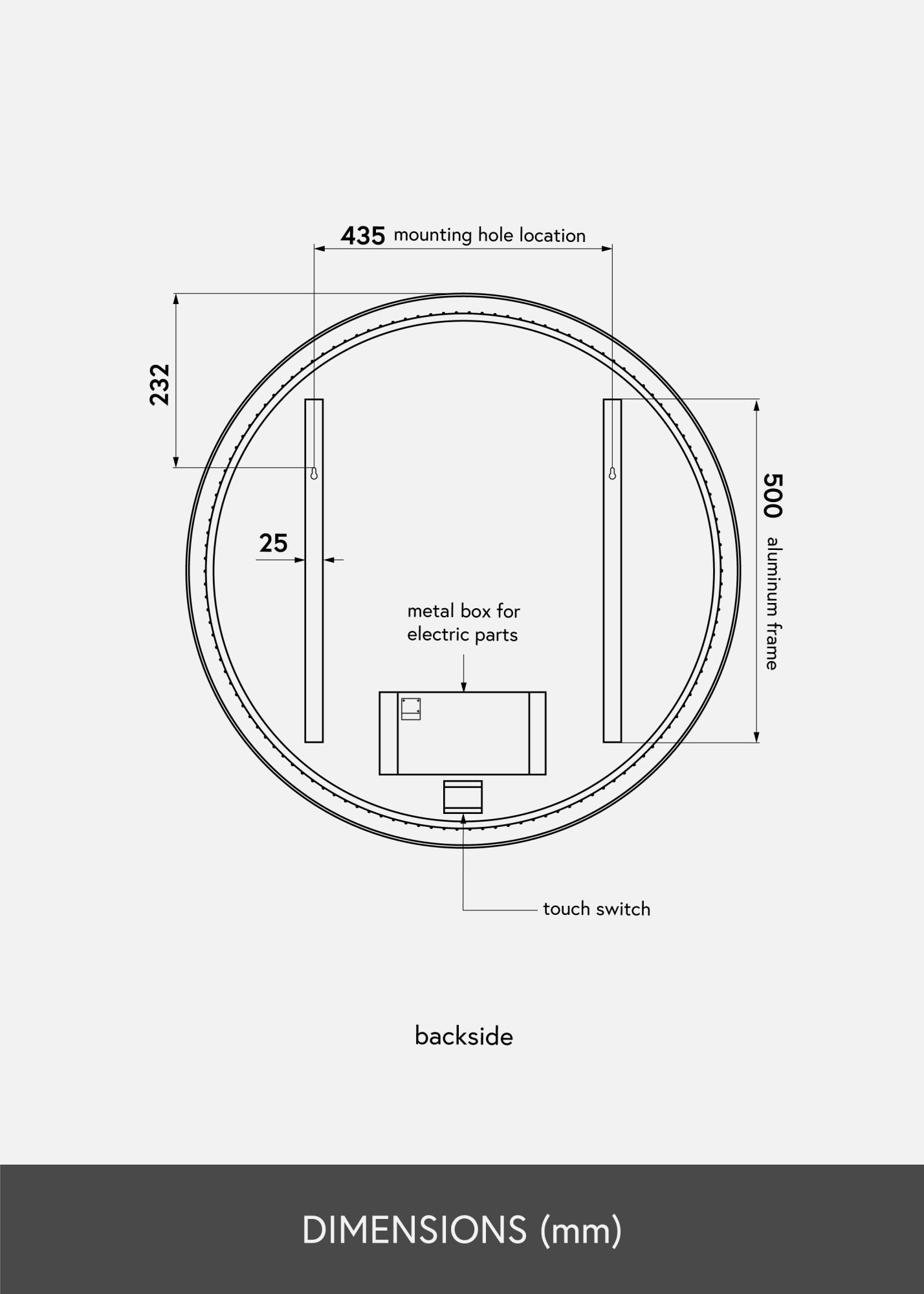 Stensko ogledalo ima površino z ogledalom s premerom 78,5 cm. Namenjeno je za fiksno namestitev in je povezano s stikalom. Da bi ogledalo pravilno delovalo, ga je treba povezati na običajno stikalo, ne na stikalno dimmer.