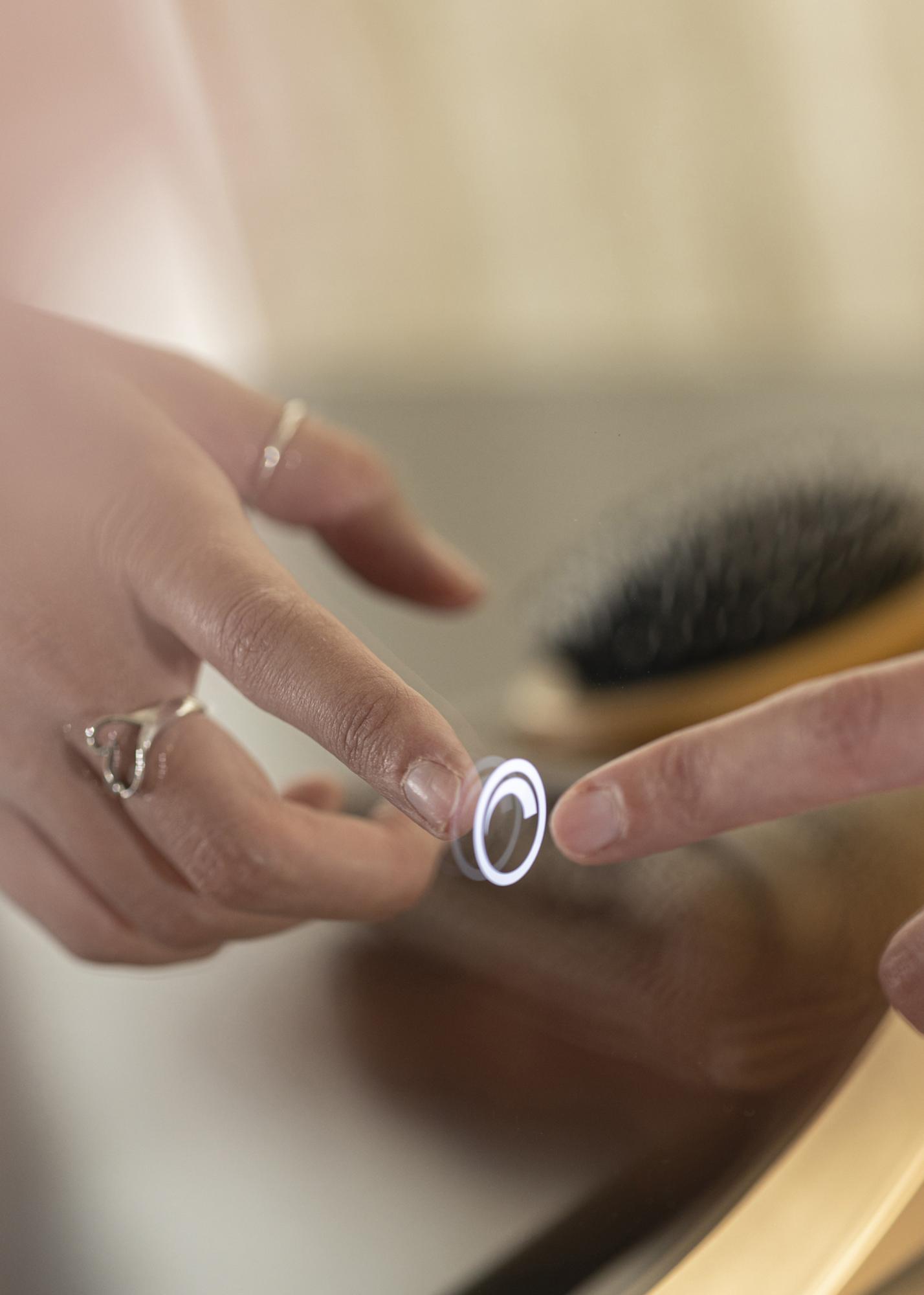 Svetloba ima prijeten sijaj, ki ga lahko enostavno zatemnite. Za prilagoditev svetlosti držite na dotik gumb na spodnjem robu zrcala nekaj sekund. Zrcalo je namenjeno za fiksno vgradnjo in naj ga namesti električar. Da bi zrcalo pravilno delovalo, ga povežite na običajno stikalo, ne na zatemnitveno stikalo.
