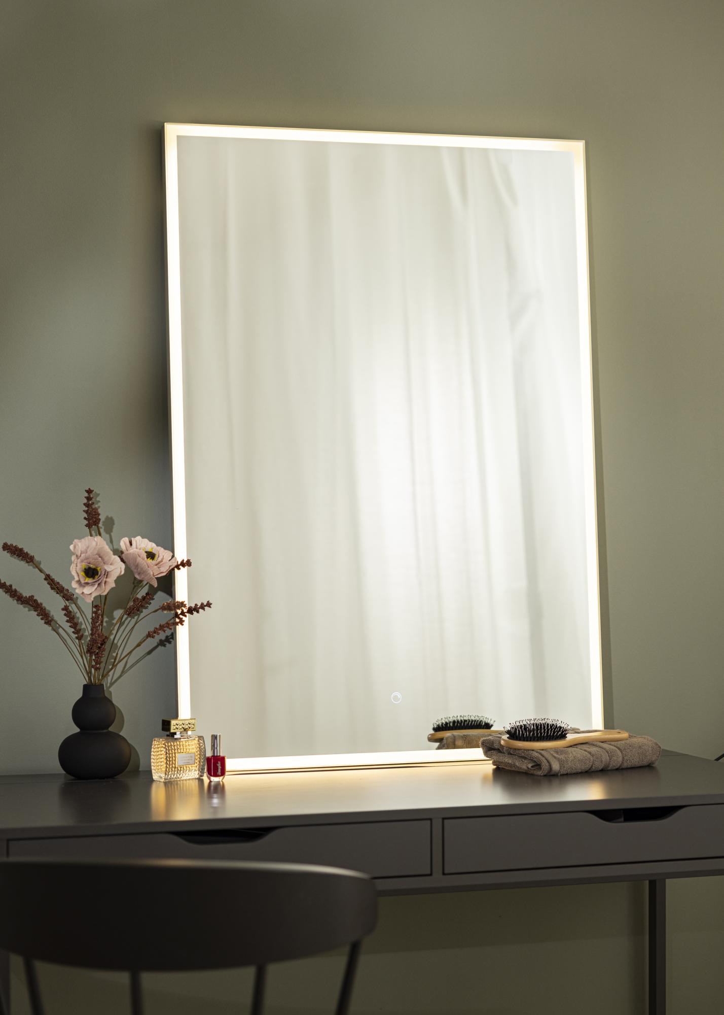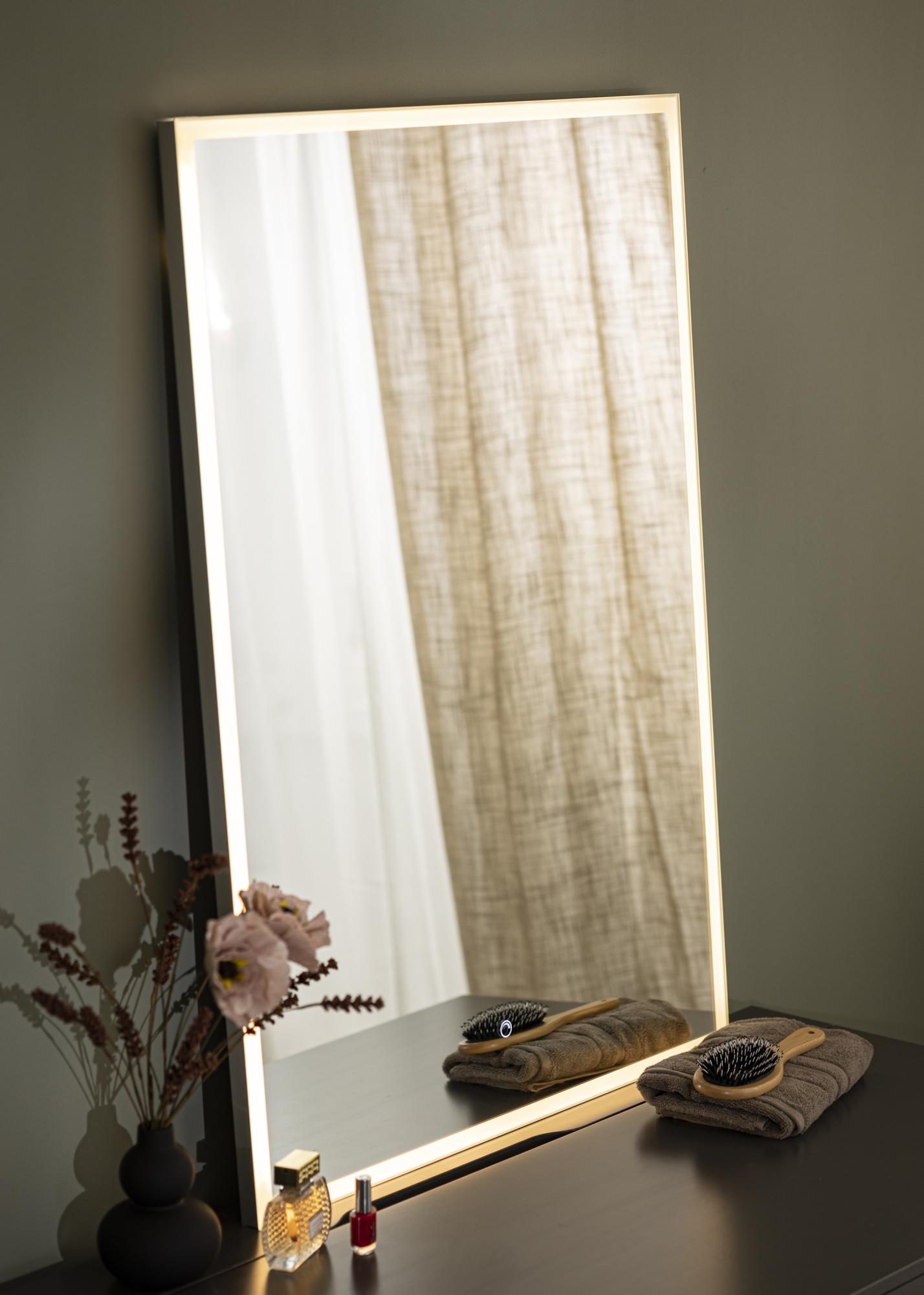 To trendovsko ogledalo z osvetlitvijo vam nudi enakomerno svetlobo, ko nanašate ličila, obenem pa je tudi zelo estetski detajl za notranjo opremo! Ogledalo ima LED osvetlitev vzdolž okvirja, ki čudovito osvetli površino ogledala velikosti 76x107 cm s sijajem pri 3000K. Za prilagoditev svetlosti držite na dotik gumb v spodnjem robu ogledala nekaj sekund.