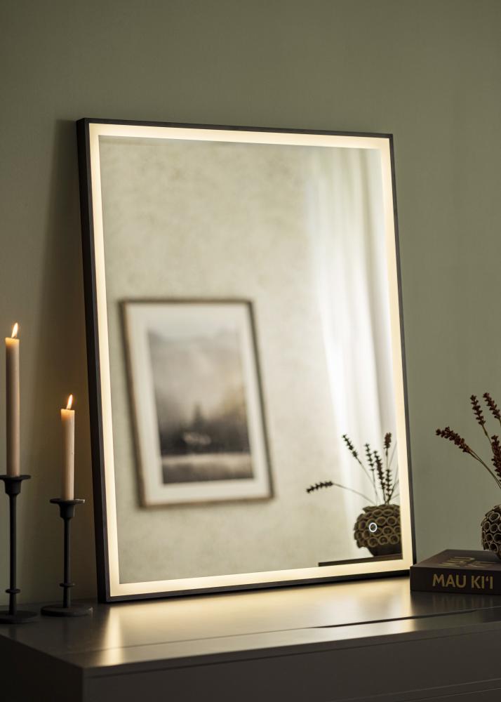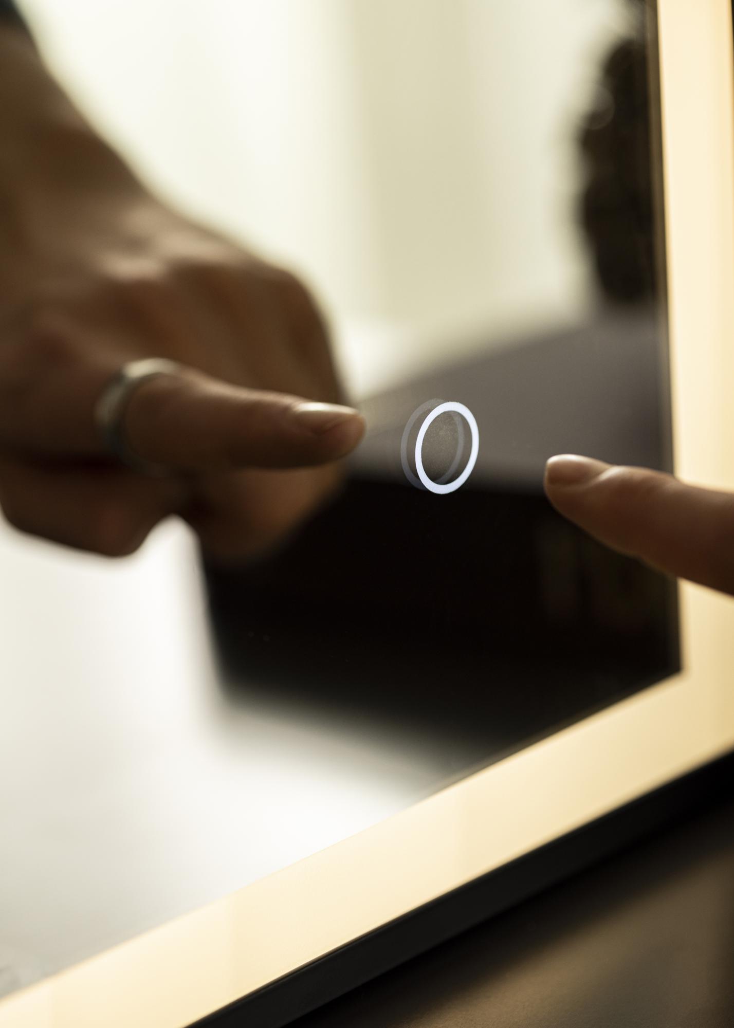 To ogledalo za kopalnico ima elegantno črno aluminijasto okvir in LED-trak, ki obdaja površino ogledala. Elegantna podoba omogoča, da se prilega ne samo kopalnici, temveč postane tudi lep dekorativni element v na primer dnevni sobi ali hodniku. LED-osvetlitev ima sijaj pri 3000K in jo je mogoče zatemniti od 10% do 100%. Za zatemnitev osvetlitve držite na tipki na dotik v enem od kotov ogledala nekaj sekund. Ogledalo je namenjeno fiksni namestitvi in je priključeno na stikalo. Da bi ogledalo pravilno delovalo, mora biti priključeno na običajno stikalo, ne na zatemnilno stikalo.
