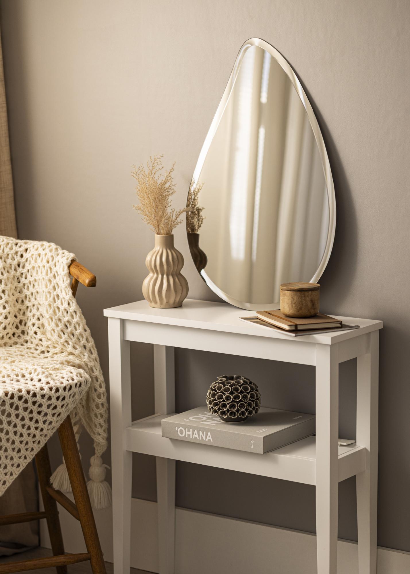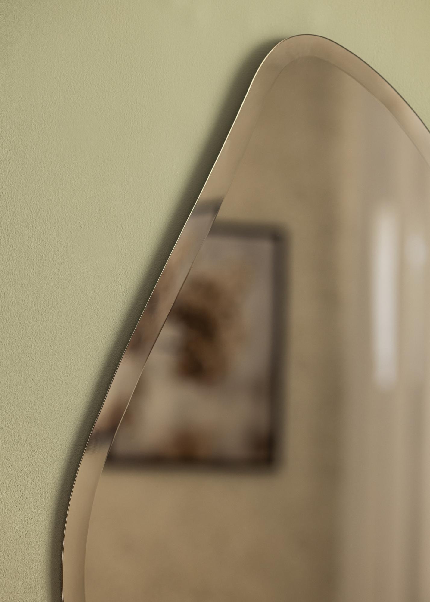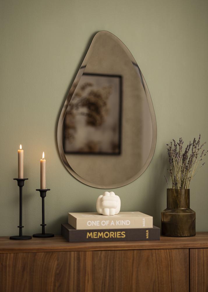To je trendovsko kapljasta ogledala s še trendovskejšim zrcalnim steklom v elegantnem odtenku temne brona. Tonirano zrcalno steklo naredi velik vtis in lepa barva brona je enostavna za kombiniranje z različnimi barvnimi shemami notranjosti. Ogledalo je zelo tanko in nima okvirja, kar v kombinaciji z razkošno brušenim robom dodatno poudari elegantno in moderno podobo. To je zelo dekorativno stensko ogledalo, ki zagotovo pritegne poglede, ne glede na sobo, v kateri je postavljeno – v dnevni sobi, hodniku ali spalnici.