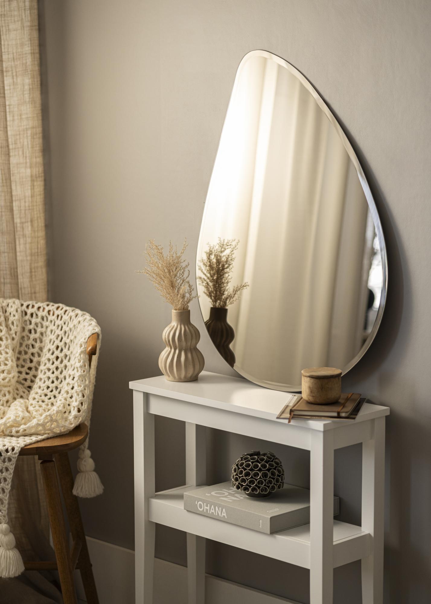 To je trendovsko ogledalo v obliki kapljice z še bolj trendovskim zrcalnim steklom, obarvano v elegantnem odtenku temne brona. Obarvano zrcalno steklo ima velik učinek in lepa bronasta barva je enostavna za kombiniranje z mnogimi različnimi barvnimi shemami v notranjosti. Ogledalo je zelo tanko in nima okvirja, kar v kombinaciji z luksuznim, fazetno brušenim robom še dodatno poudari elegantno in moderno podobo. To je zelo dekorativno stensko ogledalo, ki zagotovo pritegne poglede, kamorkoli je postavljeno – v dnevni sobi, tako kot v hodniku ali spalnici.