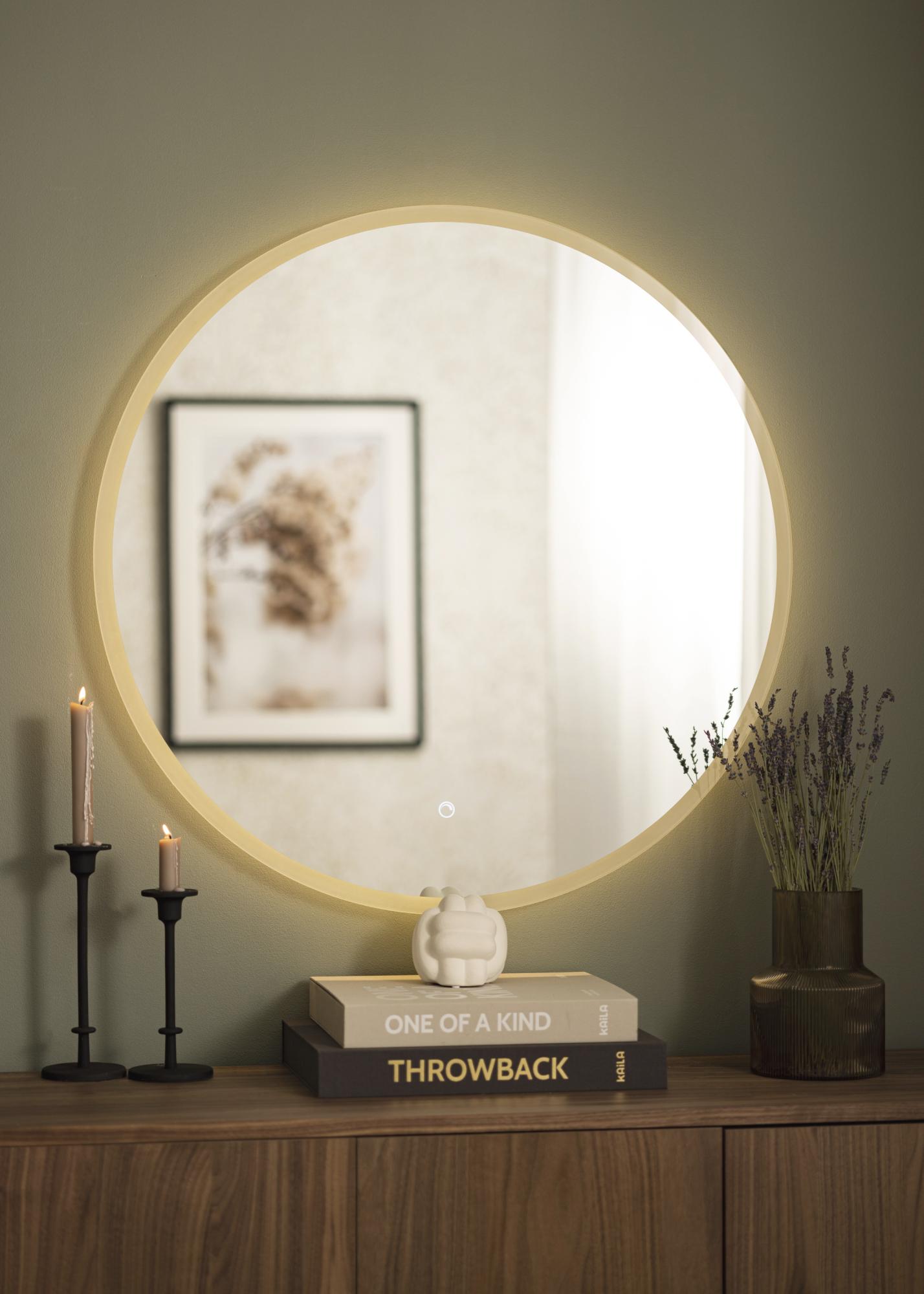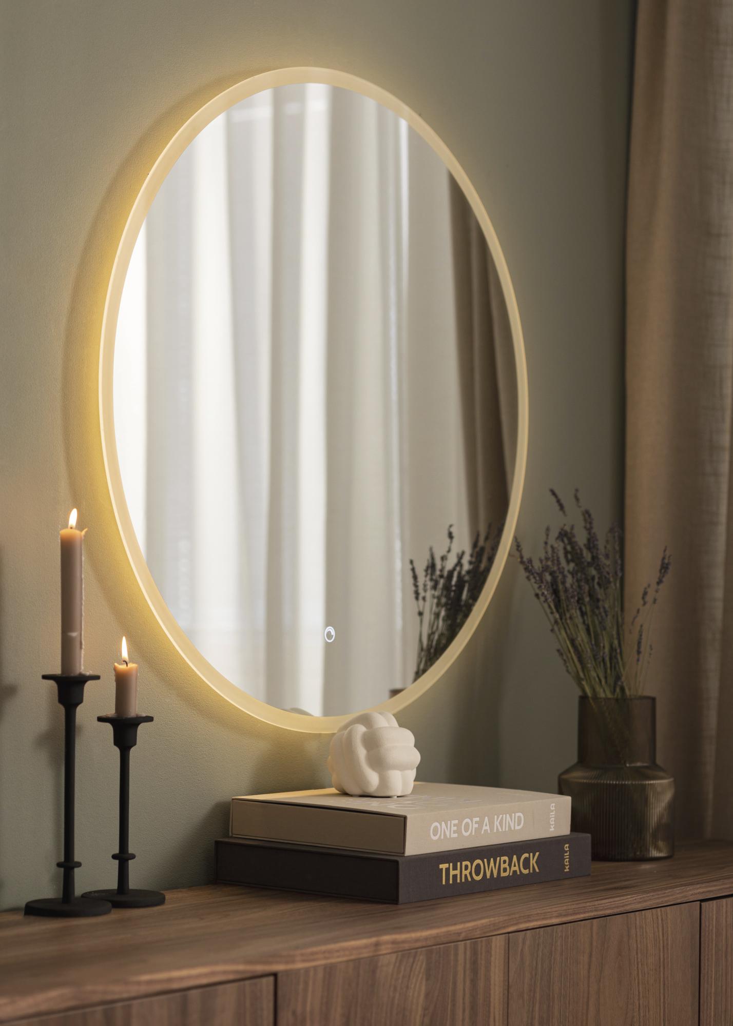To je klasično in elegantno okroglo kopalniško ogledalo. Ogledalo obkroža mat rob z integrirano LED osvetlitvijo. Osvetlitev sveti od zadaj in daje prijetno toplo belo svetlobo naprej v 3000K. Osvetlitev je zatemnljiva in moč svetlobe lahko enostavno prilagodite z držanjem gumba nekaj sekund. Naslednjič, ko prižgete osvetlitev, si bo ogledalo zapomnilo, kakšna je bila nastavljena svetlobna moč. Ogledalo ima priložene stenske nosilce in je odobreno za uporabo v kopalnici. Kopalniško ogledalo je namenjeno trajni namestitvi in se poveže s stikalom. Za pravilno delovanje ogledala ga je treba povezati z navadnim stikalom, ne s stikalom za zatemnjevanje.