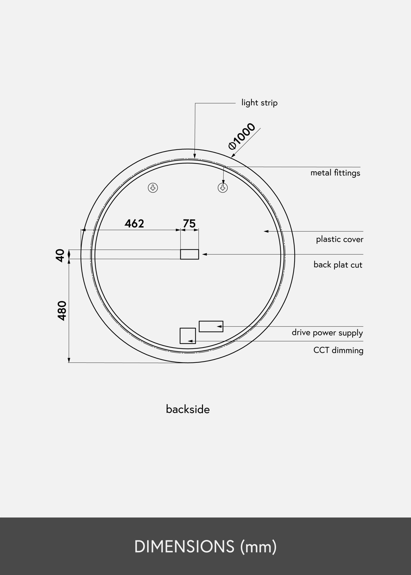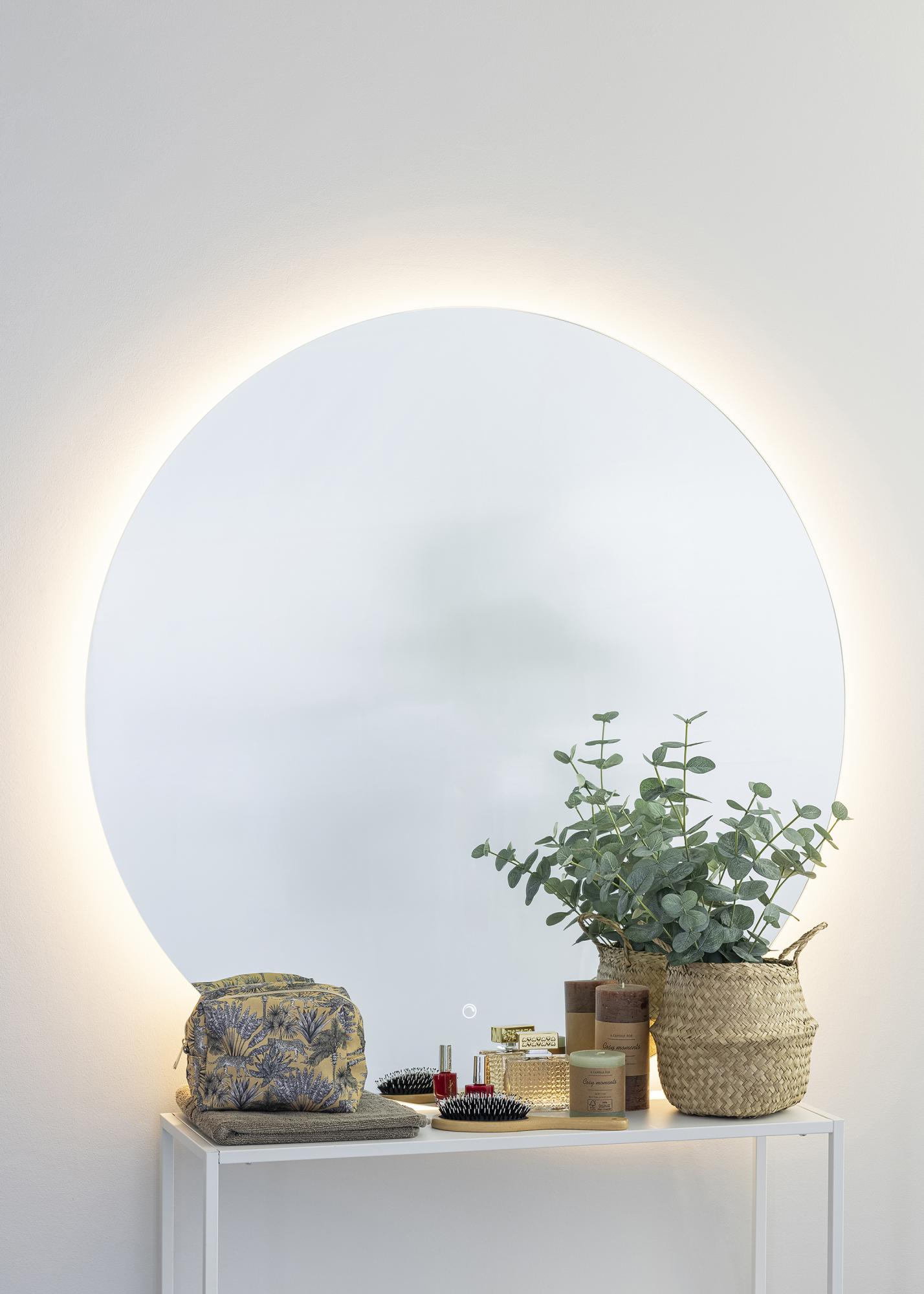 Ogledalo je odobreno za kopalnice, vendar njegov brezčasen in eleganten dizajn lepo izgleda tudi na drugih stenah doma. Ogledalo meri 100 cm v premeru, je le 3 cm globoko in ima stenske nosilce. Ogledalo je namenjeno za stalno namestitev in se poveže na stikalo. Za pravilno delovanje ogledala ga je treba povezati na običajno stikalo, ne na zatemnilno stikalo.