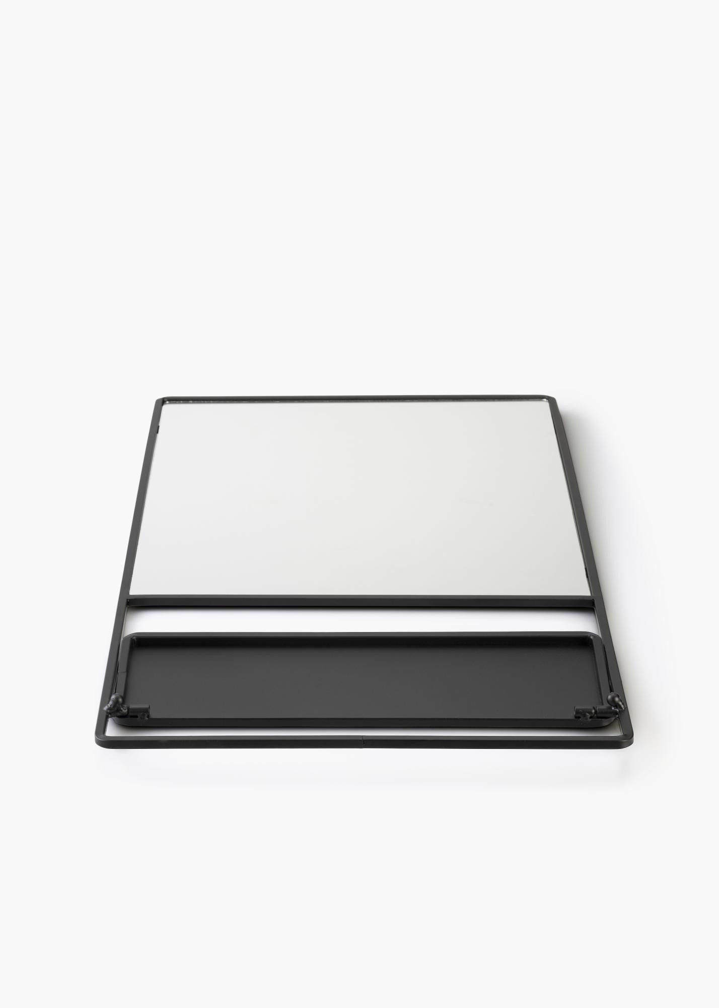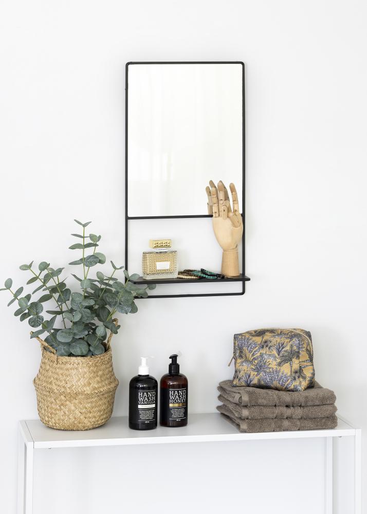 To elegantno stensko ogledalo s polico je švedski dizajn znamke KAILA. Ogledalo je v črnem odtenku in je izdelano iz kovine. Sama površina ogledala je pravokotne oblike in je obdana s črnim kovinskim robom. Na dnu je polica - popolna za postavitev lepe dekoracije ali malo shranjevanja ličil! Ogledalo meri 31x60 cm in ima stenski nosilec.
