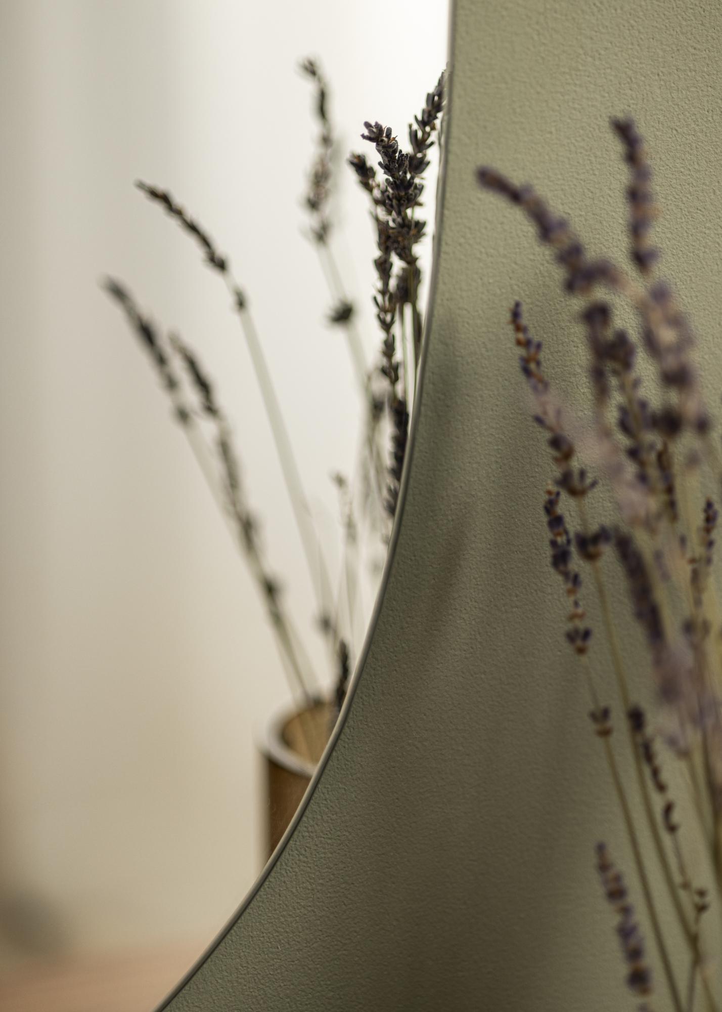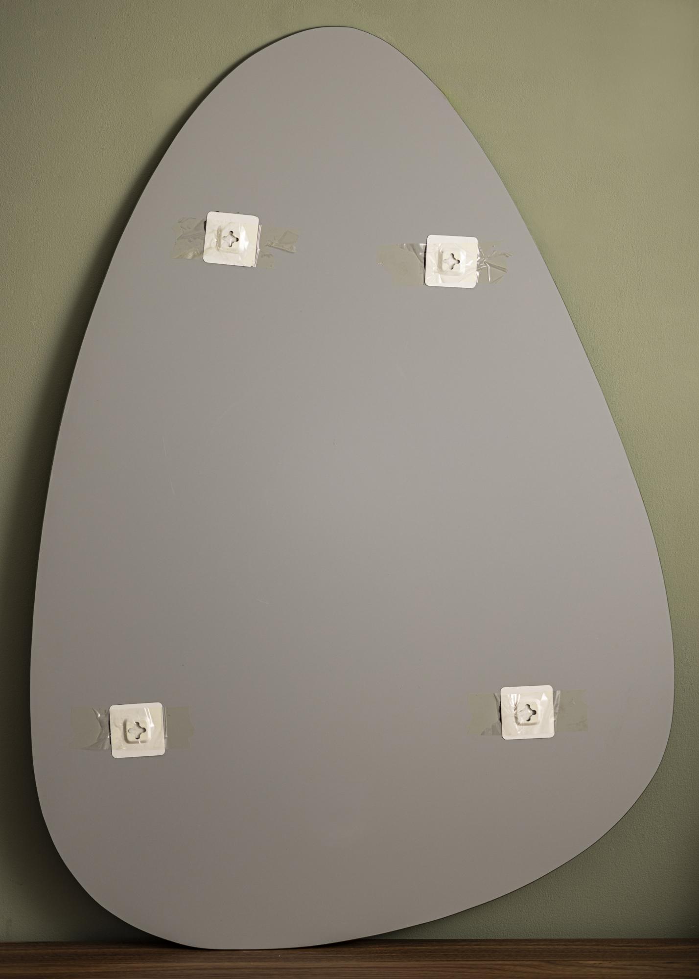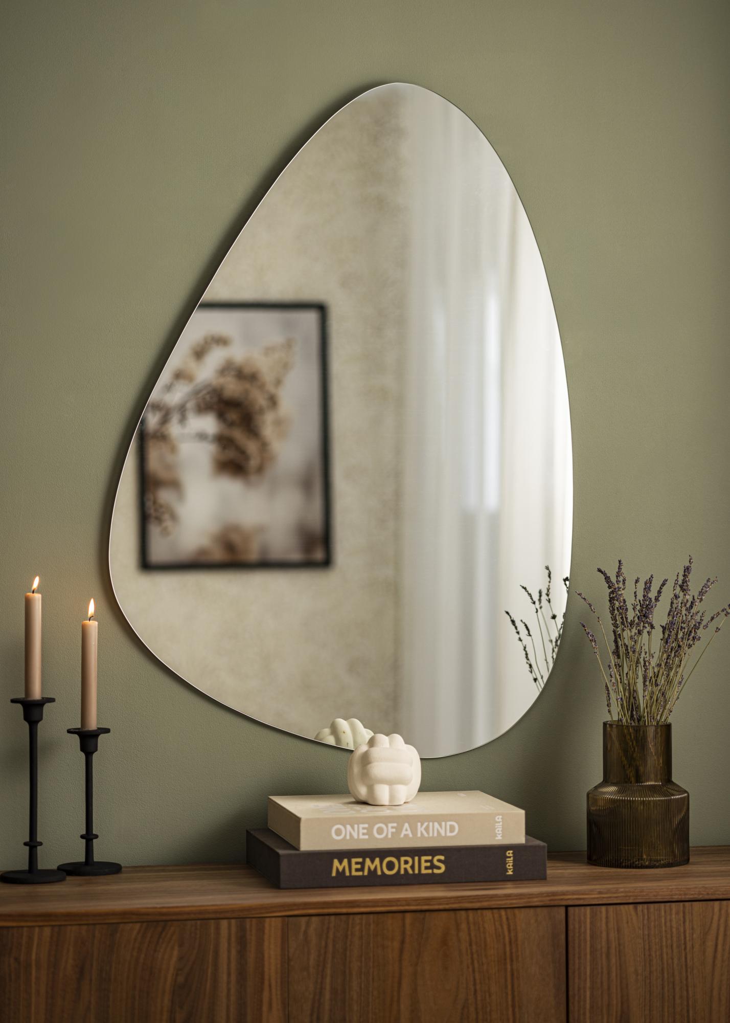 To ogledalo ima trendovsko in asimetrično obliko – skoraj kot jajce. Mehka in elegantna oblika, ki ustvarja lahkotno in vabljivo vzdušje v prostoru, v katerem se nahaja. Ogledalo je prav tako zelo tanko, kar poudari njegov eleganten in vitki videz.