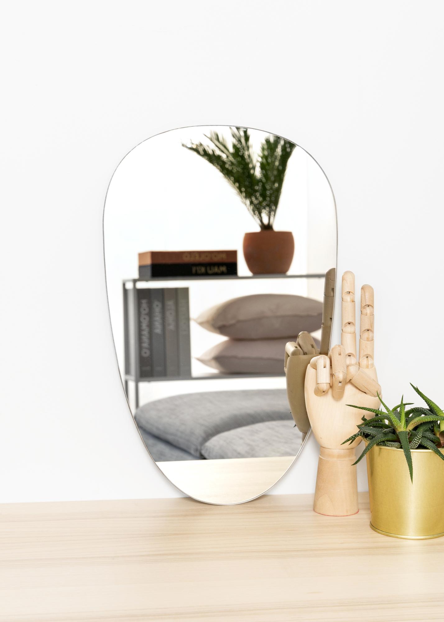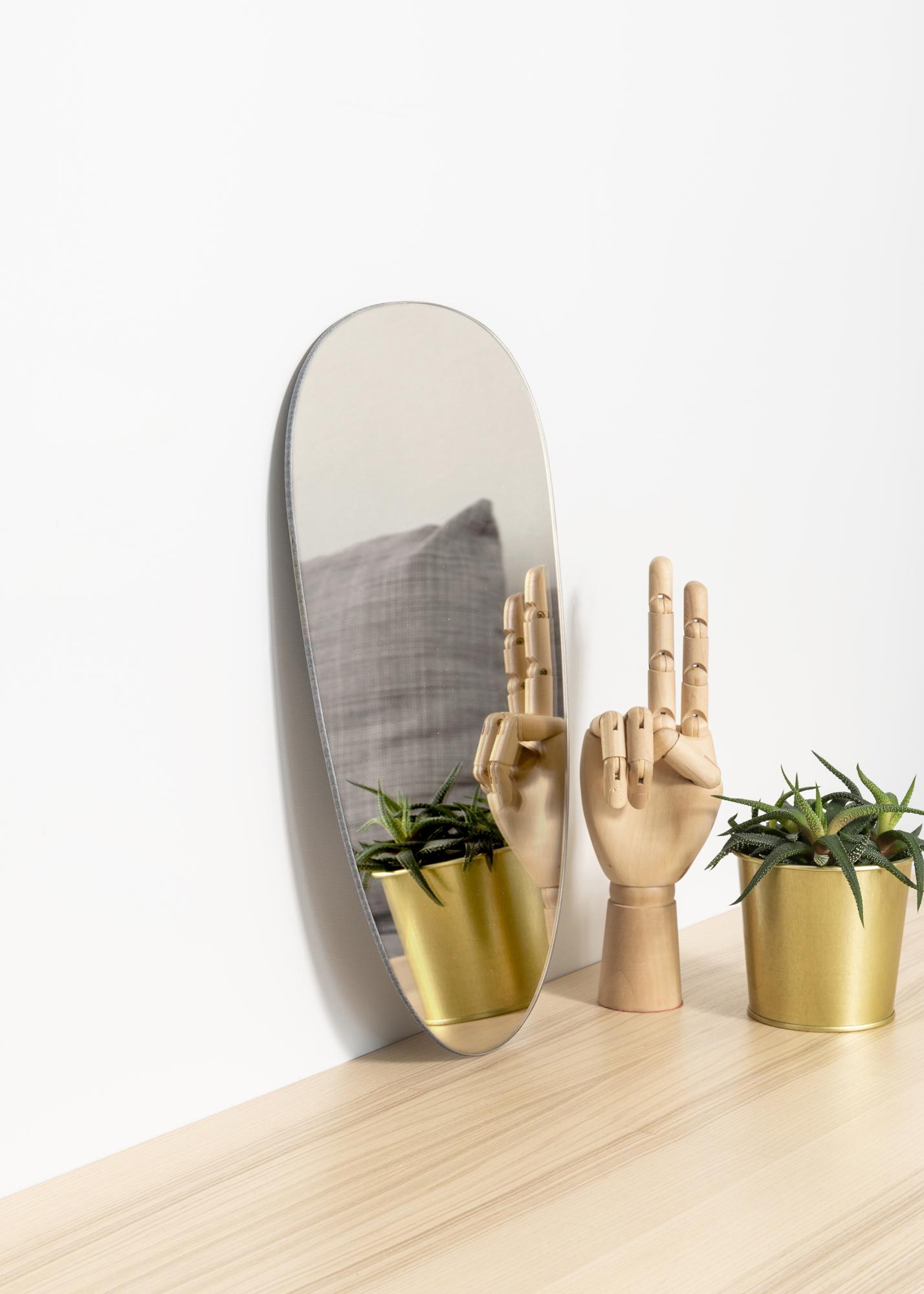 Ogledalo z vznemirljivo in nekoliko drugačno obliko daje trendovski vtis v vašem domu! To asimetrično ogledalo je prav tako le 4 mm tanko in brez okvirja, kar mu daje zelo vitko in elegantno podobo.