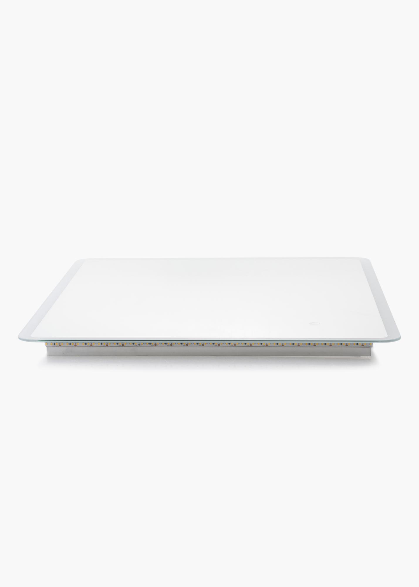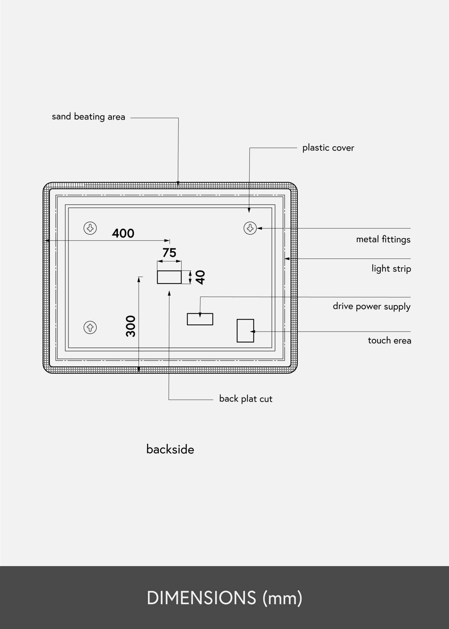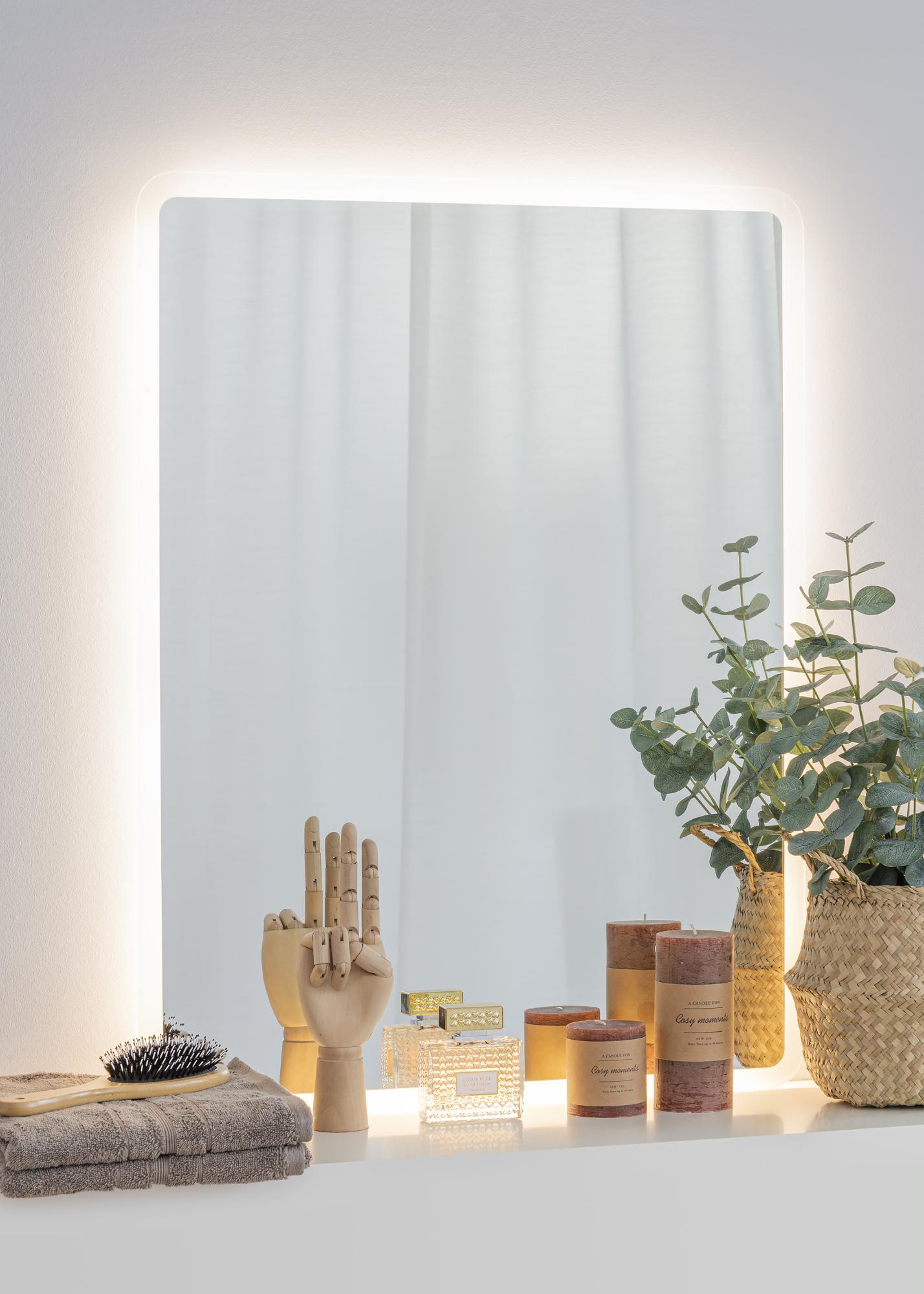 To ogledalo za kopalnico v brezčasni zasnovi ima pravokotno obliko z mehkimi robovi in zaobljenimi koti. Ob robu poteka integrirana LED razsvetljava, ki elegantno uokvirja ogledalo. LED razsvetljava sveti za ogledalom in oddaja lep sijaj naprej pri 3000K, kar je topla bela barva. Razsvetljava je zatemnilna, jakost pa enostavno prilagodite tako, da nekaj sekund držite gumb na dotik na zaslonu. Ogledalo si zapomni zadnjo nastavljeno svetlobo naslednjič, ko vklopite razsvetljavo. Ogledalo je odobreno za kopalnico. Kopalniško ogledalo je namenjeno fiksni namestitvi in je povezano na stikalo. Da bi ogledalo pravilno delovalo, ga je treba priključiti na običajno stikalo in ne na zatemnilno stikalo.