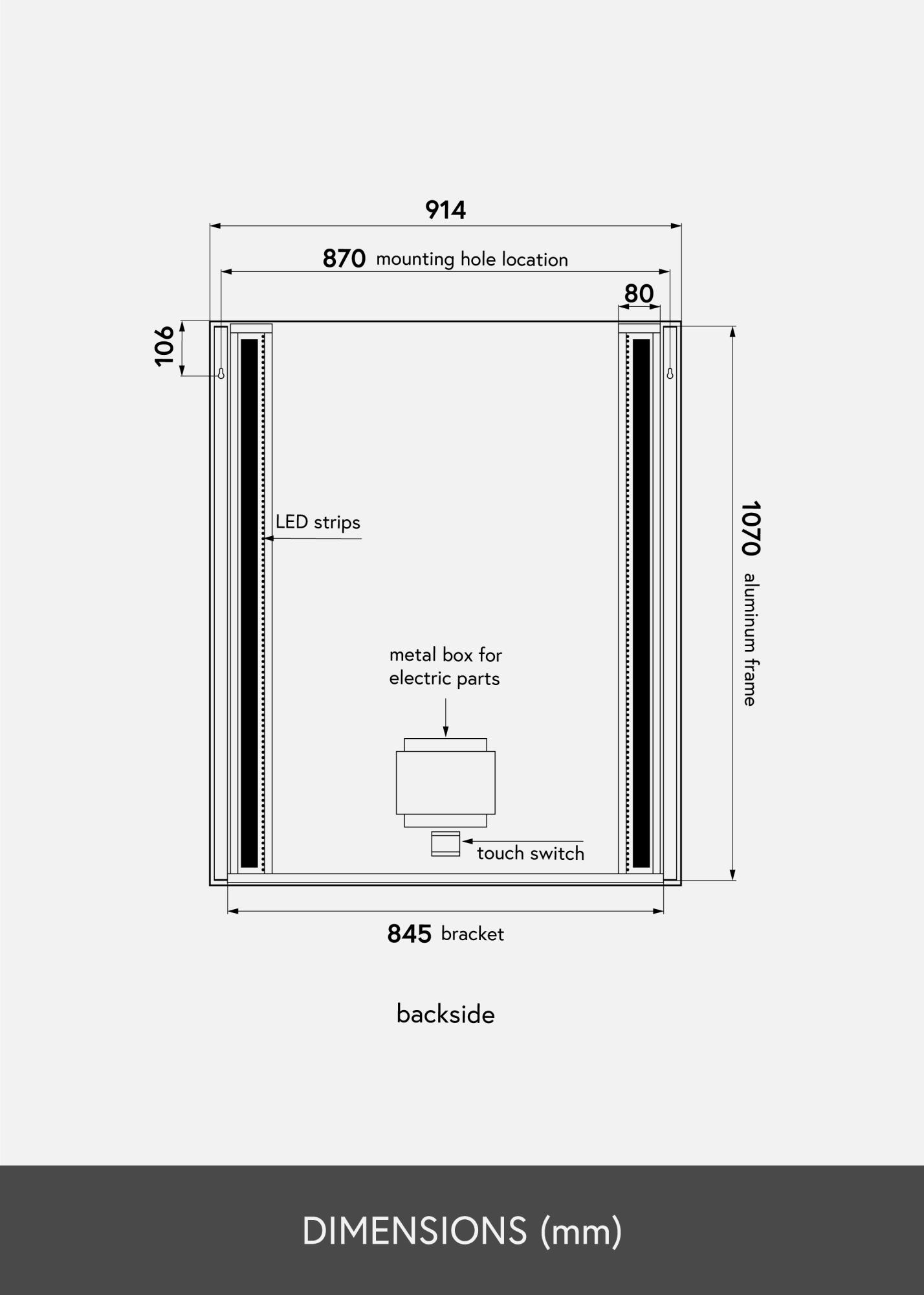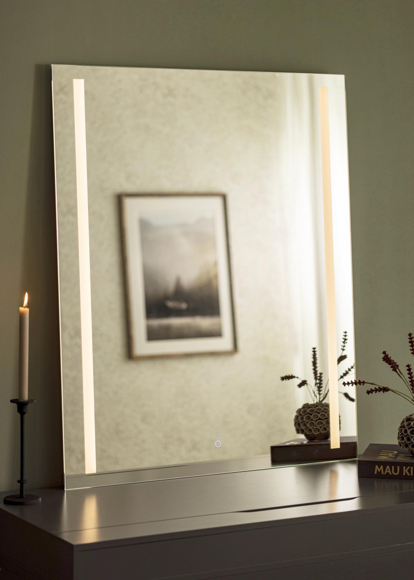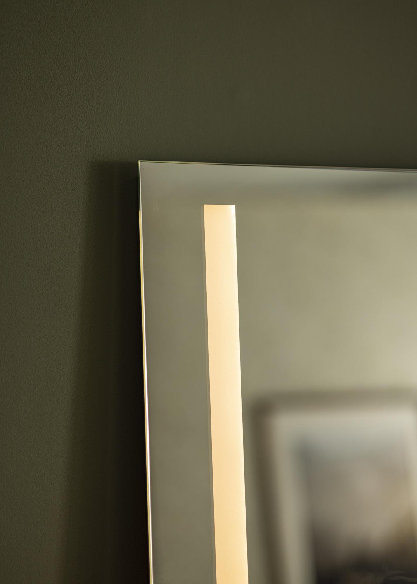To je elegantno kopalniško ogledalo z osvetlitvijo in klasično pravokotno obliko. Osvetlitev je sestavljena iz dveh LED trakov, ki sta postavljena nekoliko v notranjosti površine ogledala. To ustvarja stilski minimalistični izraz, ki se odlično poda v kopalnico. LED osvetlitev oddaja prijetno svetlobo pri 3000K in zaradi vaše udobnosti lahko enostavno zatemnite osvetlitev, tako da držite tipko na dotik na spodnjem robu ogledala. Lahko nastavite svetlost med 10-100%. Ogledalo je namenjeno fiksni namestitvi in se poveže s stikalom. Da ogledalo deluje pravilno, ga je treba priključiti na navadno stikalo namesto zatemnilnega stikala.