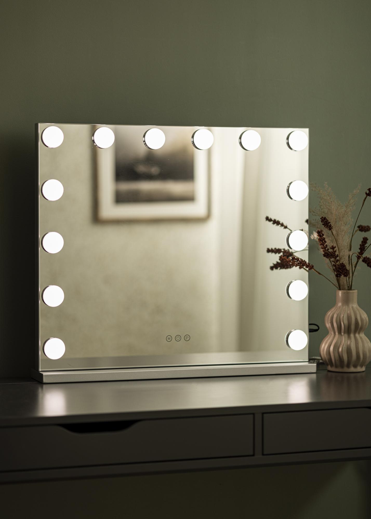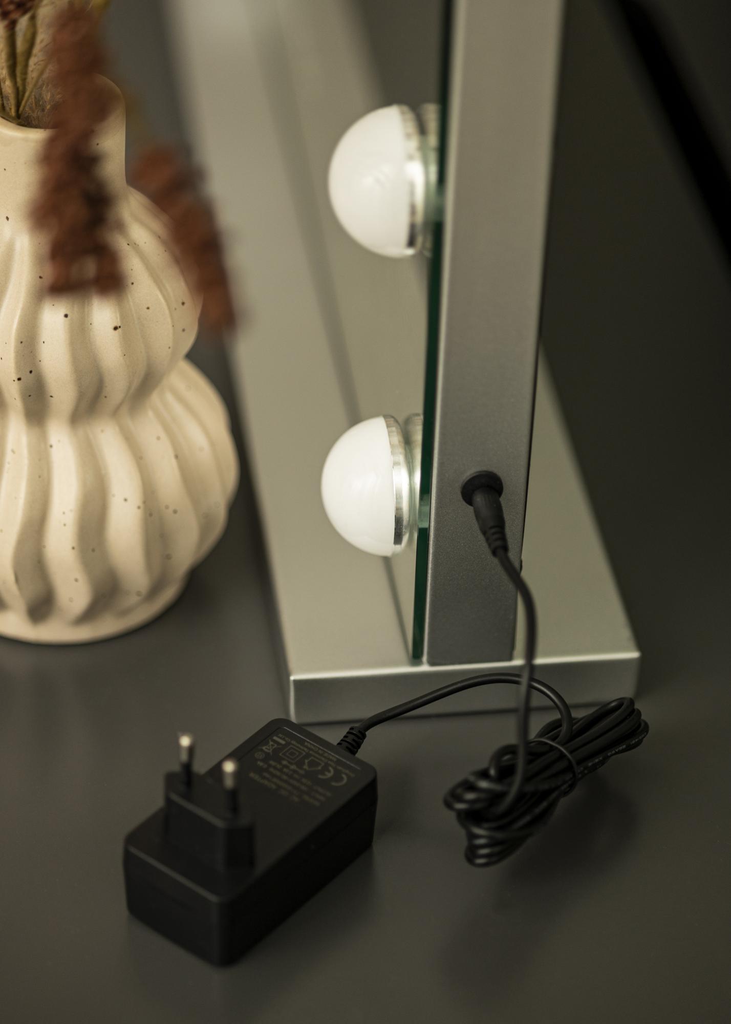 S tem ličilnim ogledalom boste v svoj dom vnesli več glamurja, zahvaljujoč luksuzni zasnovi s 14 velikimi LED-lučkami, ki ustvarjajo okvir okoli ogledalne površine. Srebrn odtenek in pravokotna oblika še bolj poudarita eleganten videz. Ogledalo lahko bodisi pritrdite na steno ali ga postavite samostojno kot dekoracijo na omare in stranske mize. Ogledalo se priklopi z vtičem.