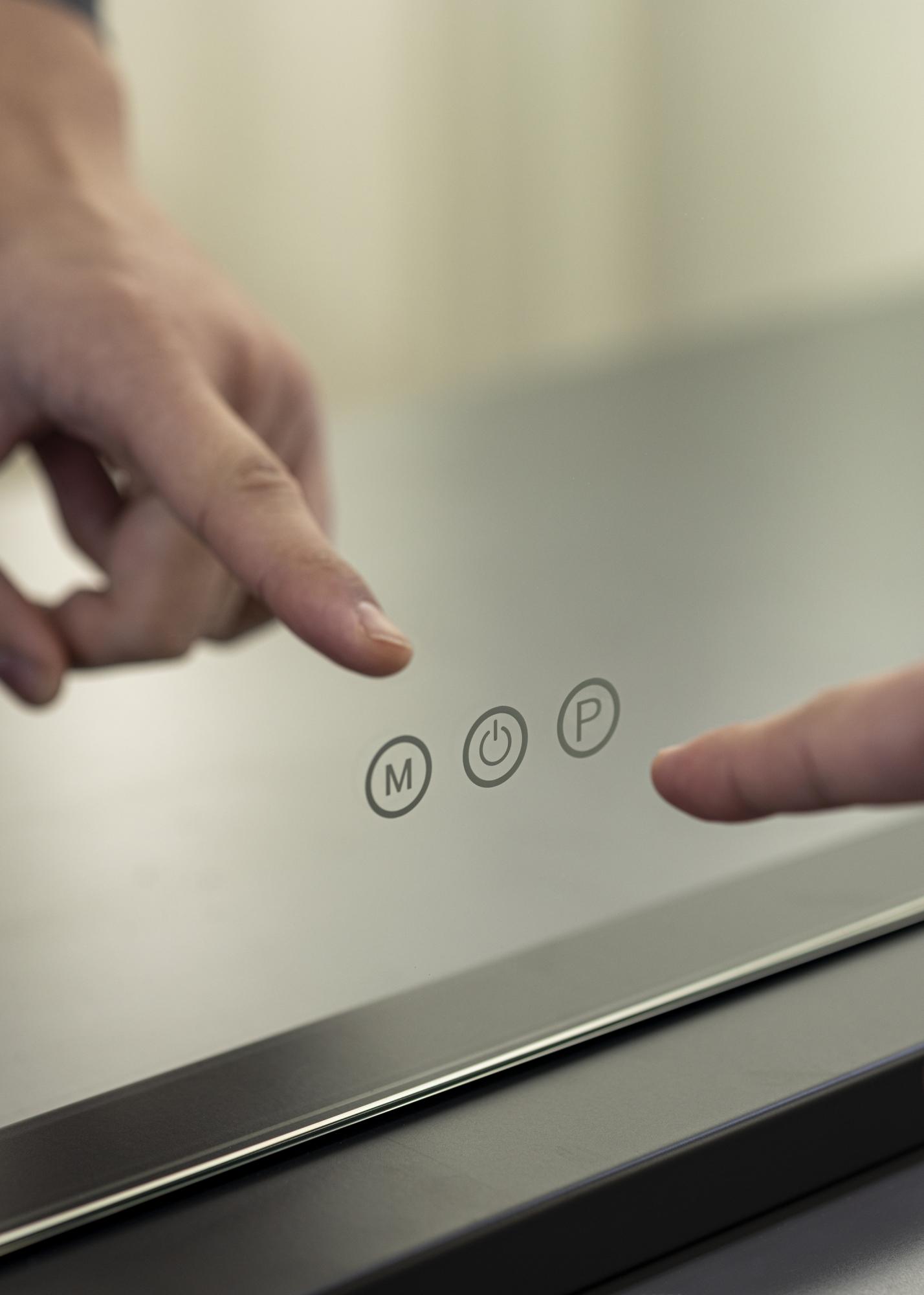 Osvetlitev na tem ogledalu je zatemnjena in ima barvno temperaturo od 3000K do 6000K. Osvetlitev lahko enostavno prilagodite svojim željam s pomočjo tipk na dotik na površini ogledala. Če držite tipko "P", lahko zatemnite luč, s pomočjo tipke "M" pa nastavite, ali želite toplo, hladno ali naravno svetlobo. Na voljo je tudi gumb za vklop/izklop, ki ga lahko uporabite za vklop ali izklop osvetlitve ogledala.