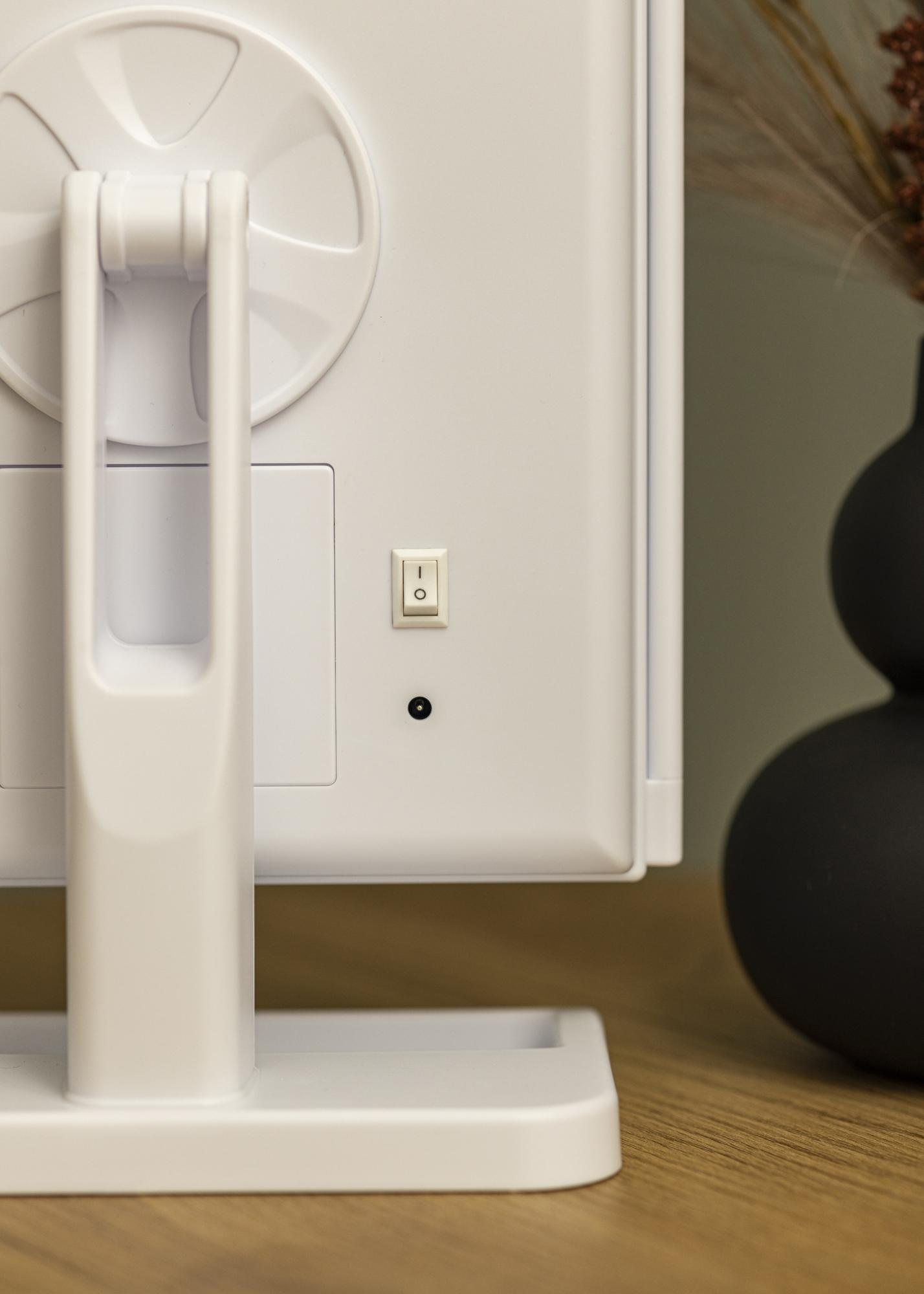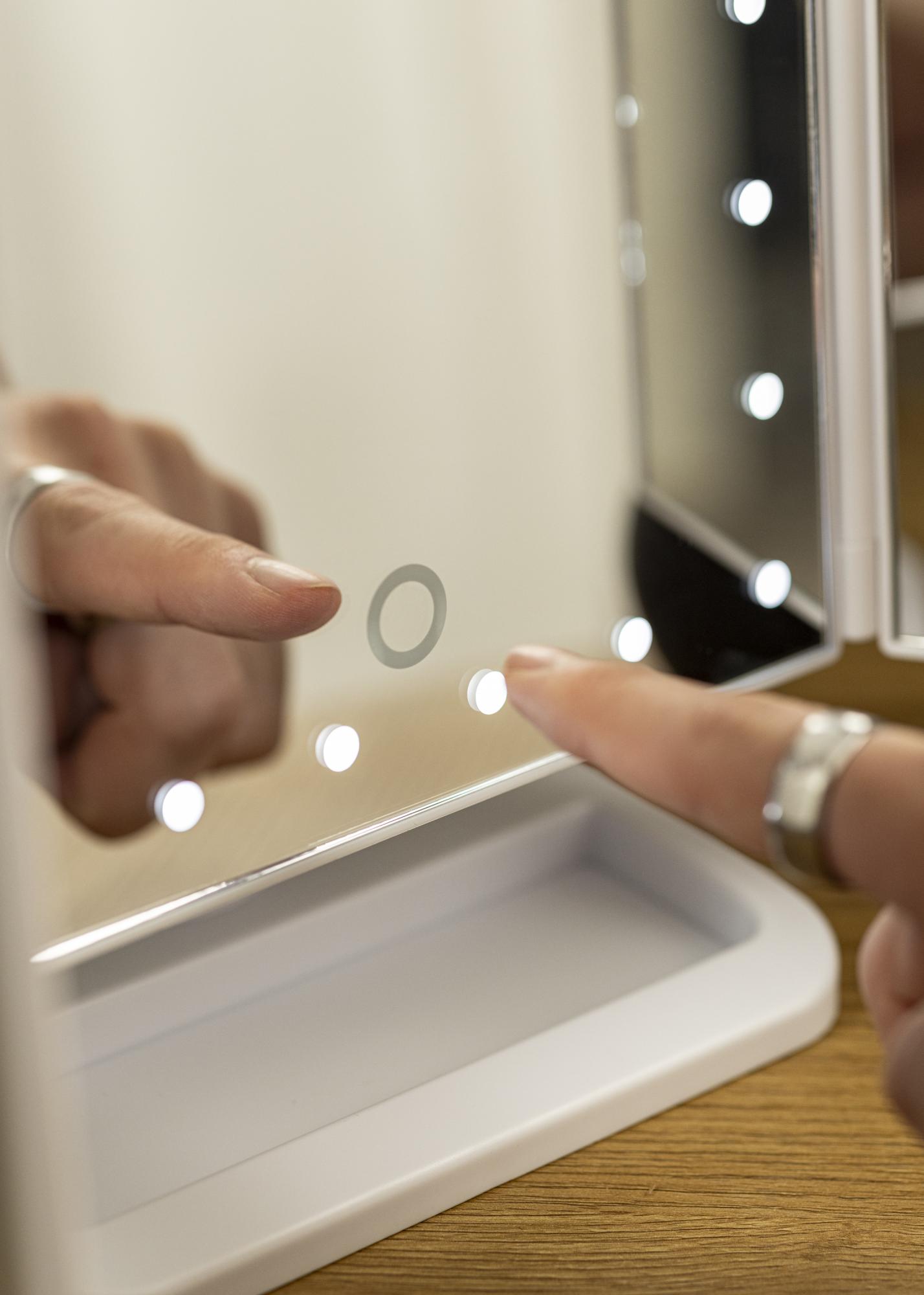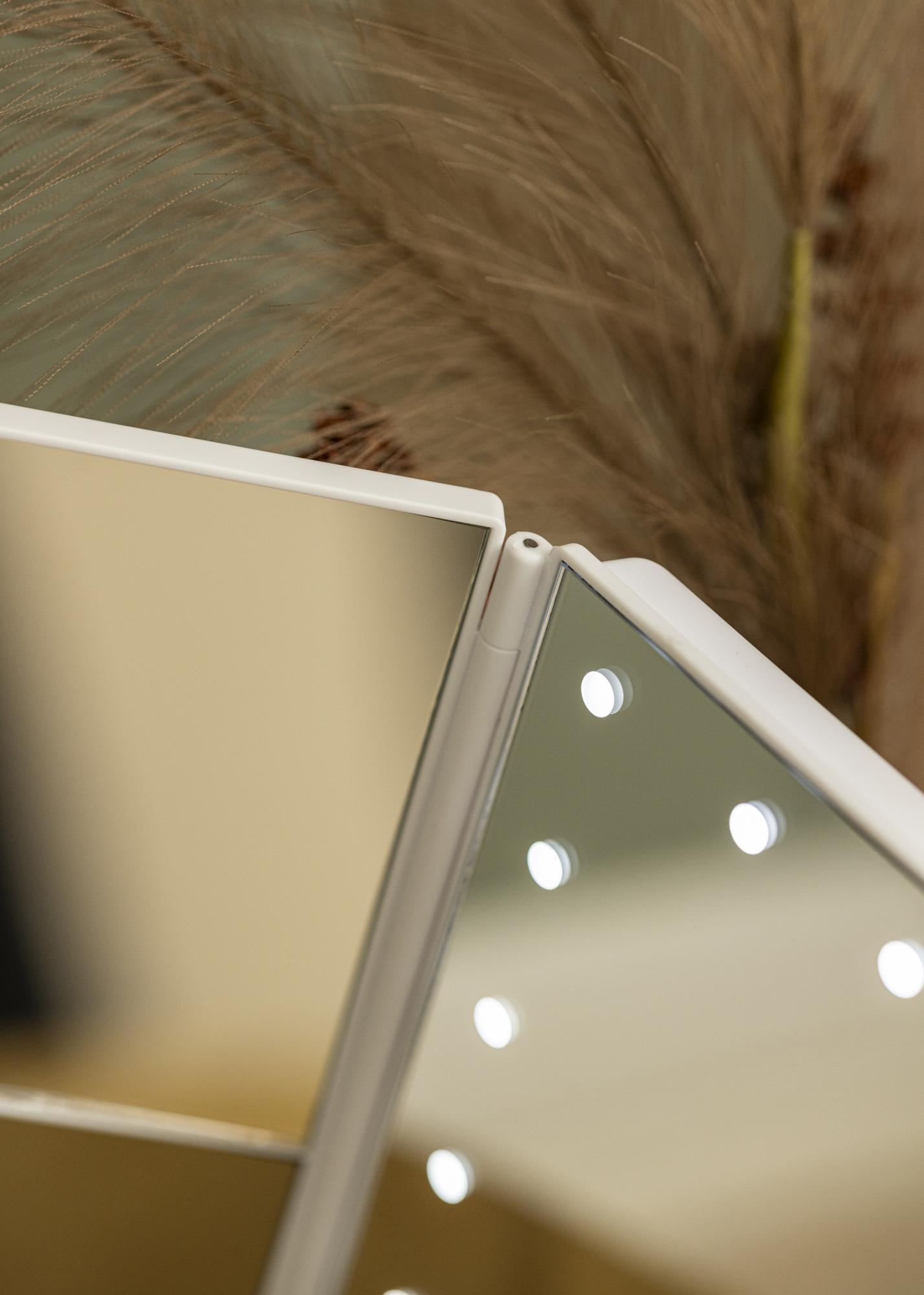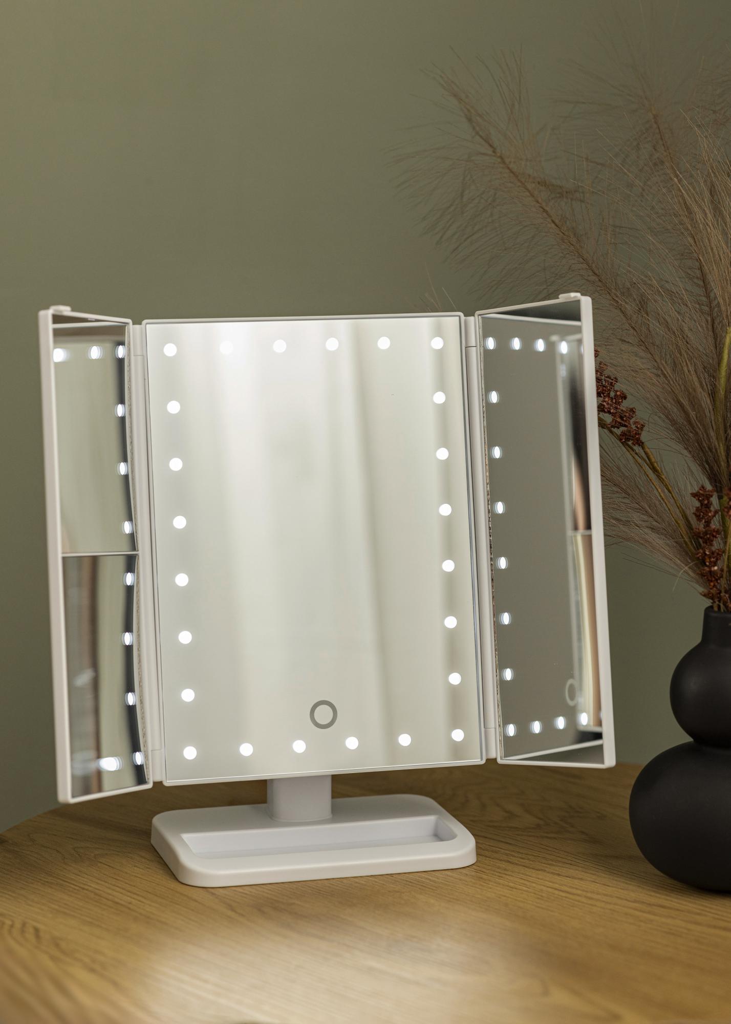 Eleganten bel 4-v-1 makeup ogledalo v švedskem dizajnu znamke KAILA. To makeup ogledalo vam omogoča, da se zrcalite iz različnih kotov s tremi stranskimi ogledali in ima nastavljivo nogo, ki omogoča, da se ogledalo vrti za 180°. Leva stran ličilnega ogledala ima povečevalno steklo z 2X in 3X zoomom. Okrog velike srednje zrcalne površine je 24 dekorativnih LED-lučk, ki oddajajo prijetno toplo belo svetlobo pri 3000K. Vgrajena LED osvetlitev se vklopi s pritiskom na tipko na dotik in se preprosto nastavi tako, da tipko držite nekaj sekund. Makeup ogledalo meri 38x25 cm in se preprosto zloži, ko ni v uporabi.