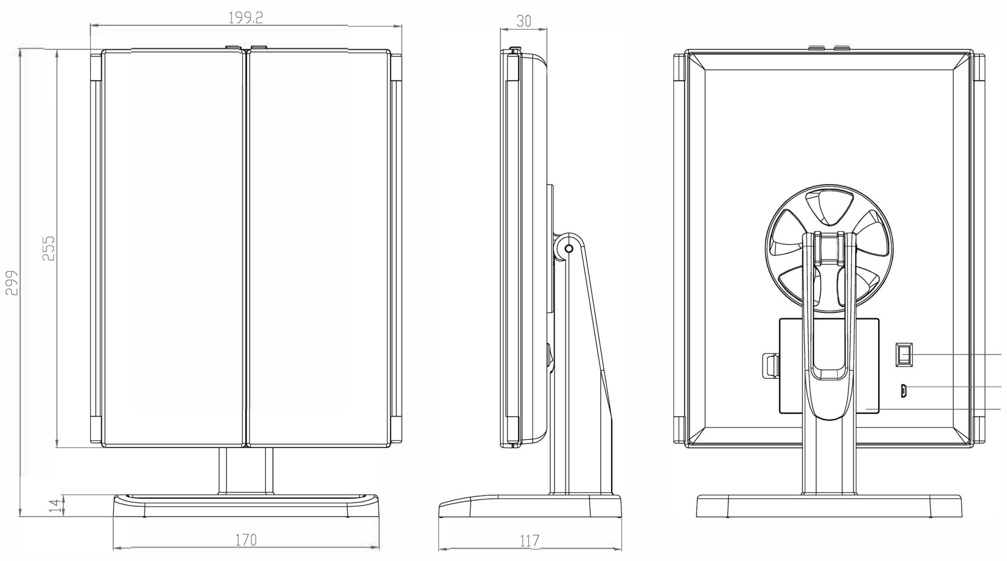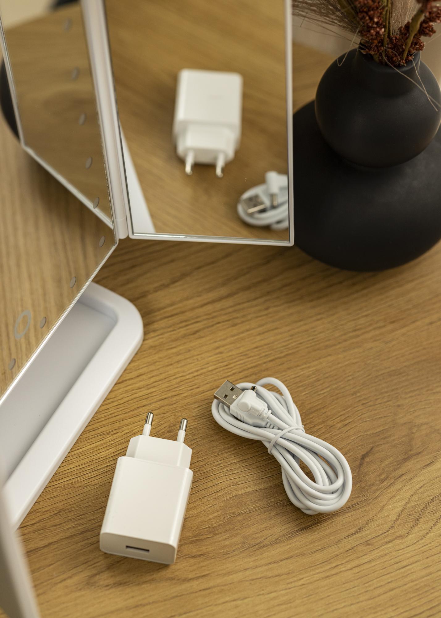 Ogledalo je izdelano iz ABS za najboljšo možno kakovost in svetlobni vir LED je naravna svetloba, ki porabi manj energije. Ogledalo deluje s 4x AA baterijami (niso priložene) ali se polni z priloženim USB stenskim adapterjem in USB kablom.