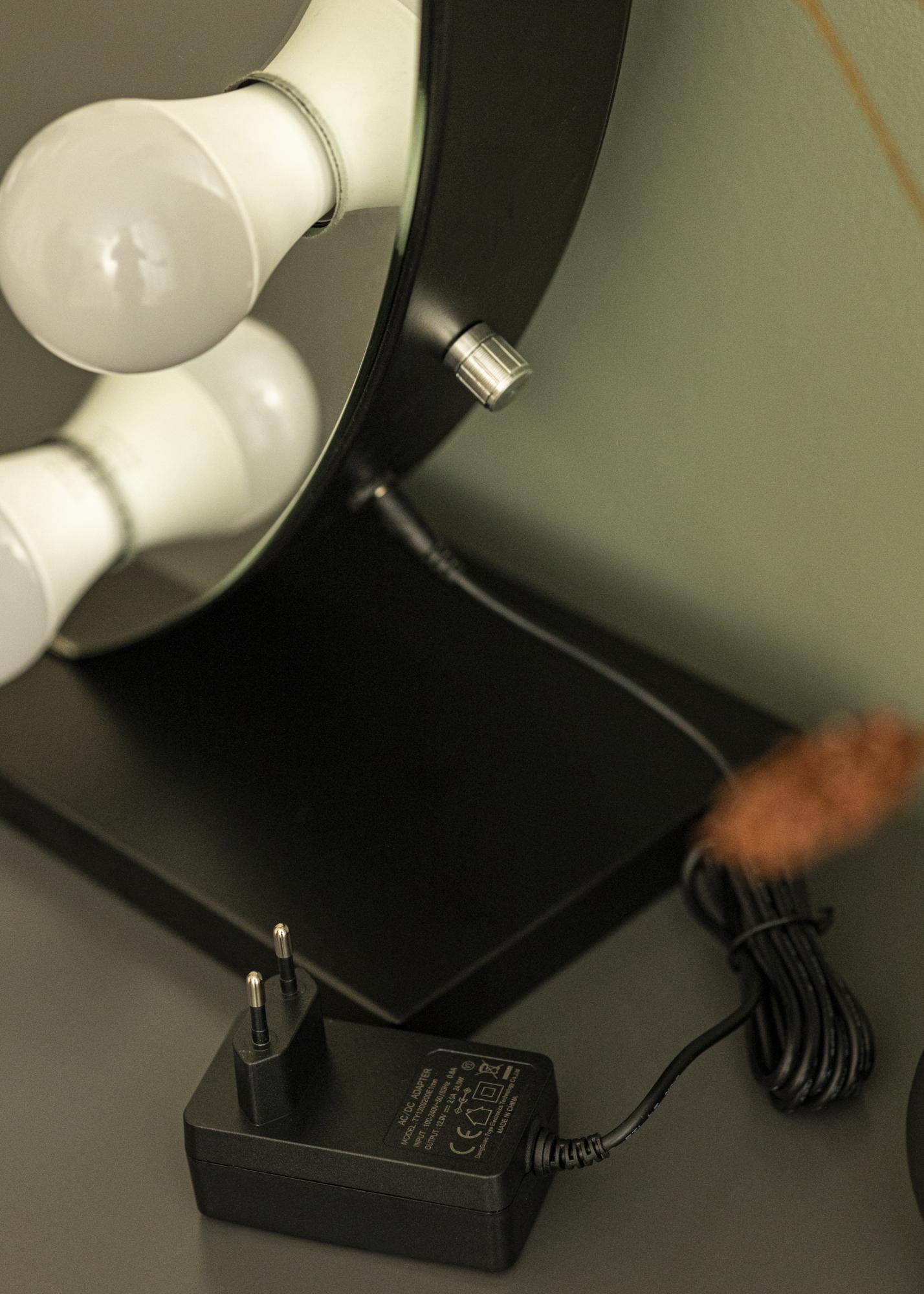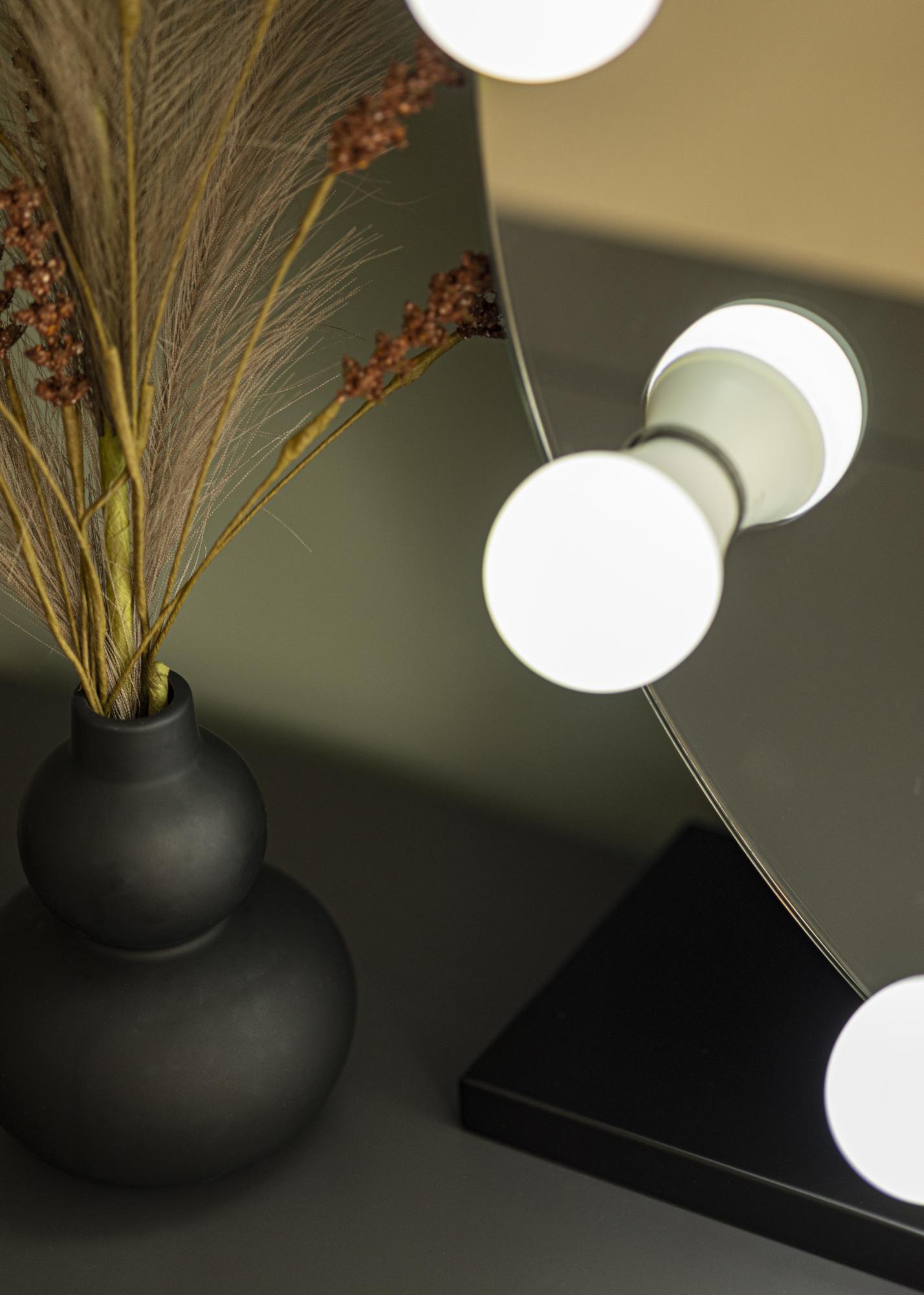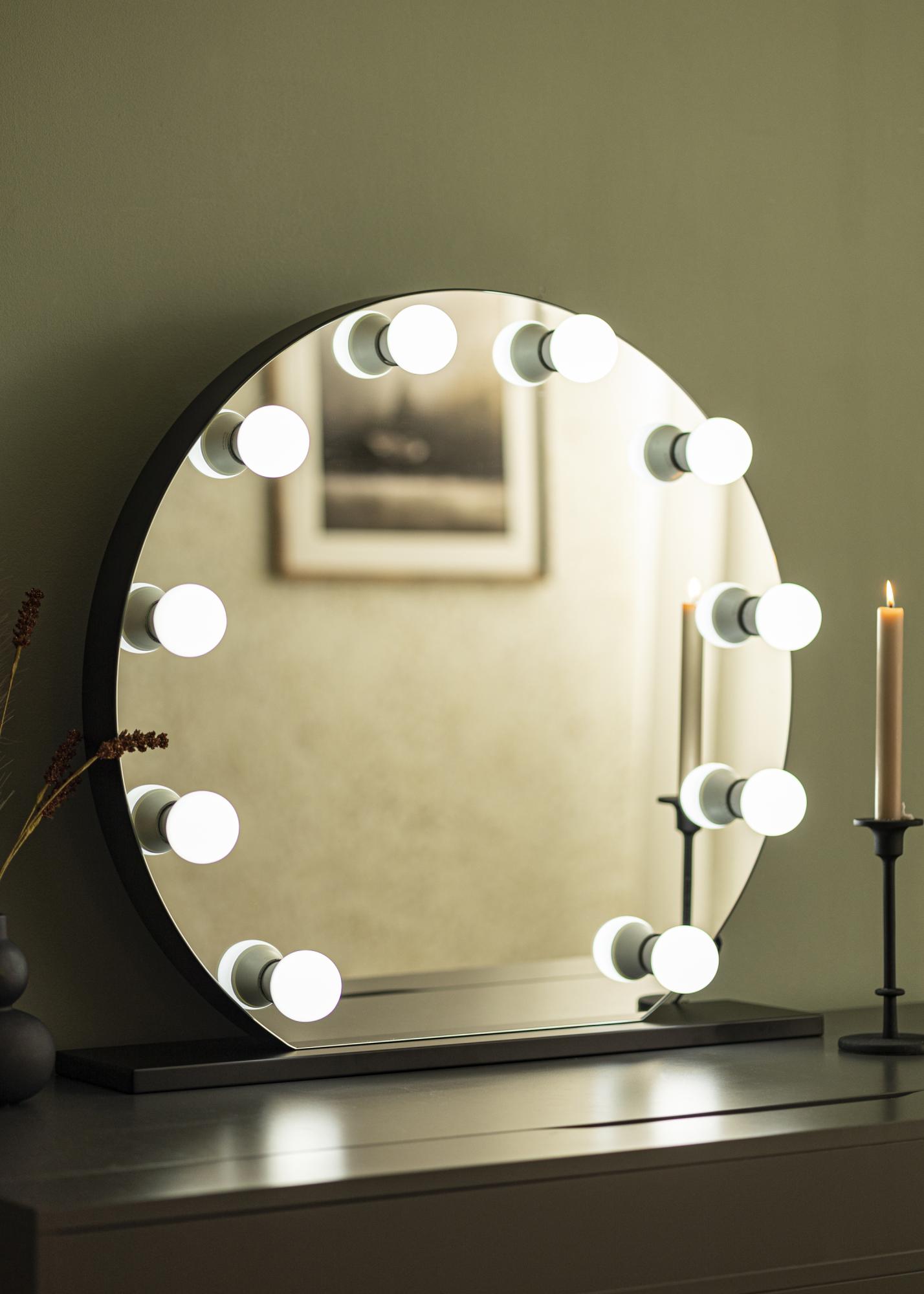 To dekorativno ogledalo za ličenje vam ponuja slog in funkcionalnost v enem paketu! Ima elegantno zasnovo, z okroglo obliko, elegantnim črnim stojalom in 10 žarnicami z okovjem E27, ki lepo uokvirjajo površino ogledala. Integrirana osvetlitev s hladno belo svetlobo je popolna, ko se pripravljate na dan. Ogledalo se lahko postavi pokonci, kar vam omogoča, da ga enostavno postavite v spalnico, dnevno sobo ali hodnik, kjer lahko osvetlitev ogledala za ličenje služi tudi kot lepo ozadje. Ogledalo se lahko tudi montira na steno. Osvetlitev je zatemnjena in za prilagoditev osvetlitve zavrtite gumb, ki se nahaja na kratki strani ogledala.