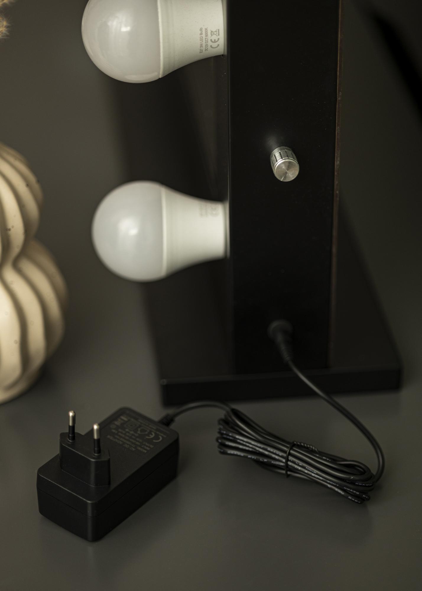 Ta toaletna ogledala ima eleganten hollywoodski dizajn, ki bo popestril vaš kotiček za ličenje ali dnevno sobo. Ogledalo ima vgrajeno osvetlitev v obliki 14 zamenljivih žarnic, ki so nameščene na črnem okvirju ogledala. Žarnice so zamenljive in imajo osnovo E27. Osvetlitev oddaja hladno belo svetlobo. Na eni strani ogledala je gumb, ki ga lahko zavrtite za zatemnitev svetlobe do želene jakosti.