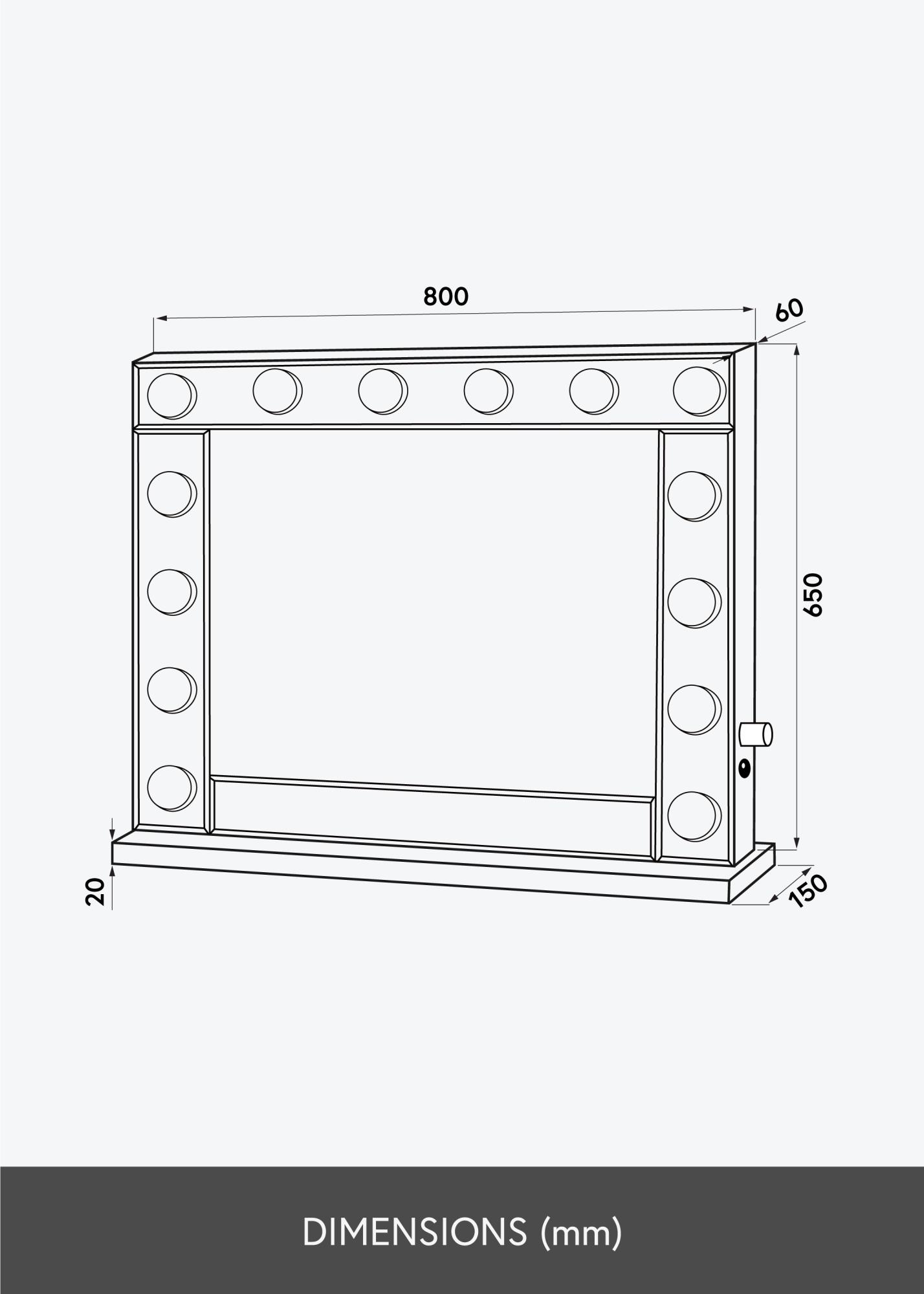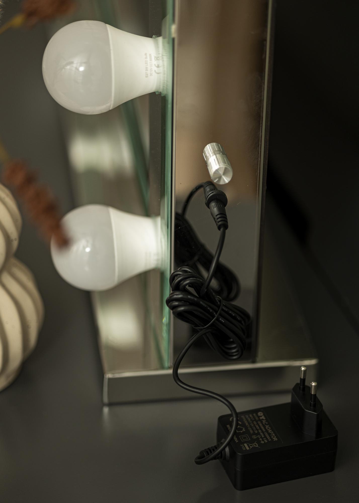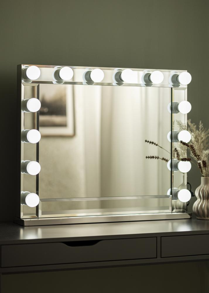 Dodajte pridih razkošja svojemu domu s to lično ogledalo v hollywoodskem dizajnu. Ogledalo ima srebrn okvir, okrašen s 14 svetilkami, ki dajejo ogledalu razkošen videz. Svetilke so zamenljive in imajo podnožje E27. Svetilke oddajajo hladno belo svetlobo. Če želite, lahko izberete zatemnitev osvetlitve na svetlost, ki ustreza vašim potrebam – svetla osvetlitev je odlična za ličenje, medtem ko je bolj zatemnjena svetloba boljša kot osvetlitev v ozadju. Ta prilagoditev se enostavno izvede s pomočjo majhnega gumba na kratki strani ogledala.